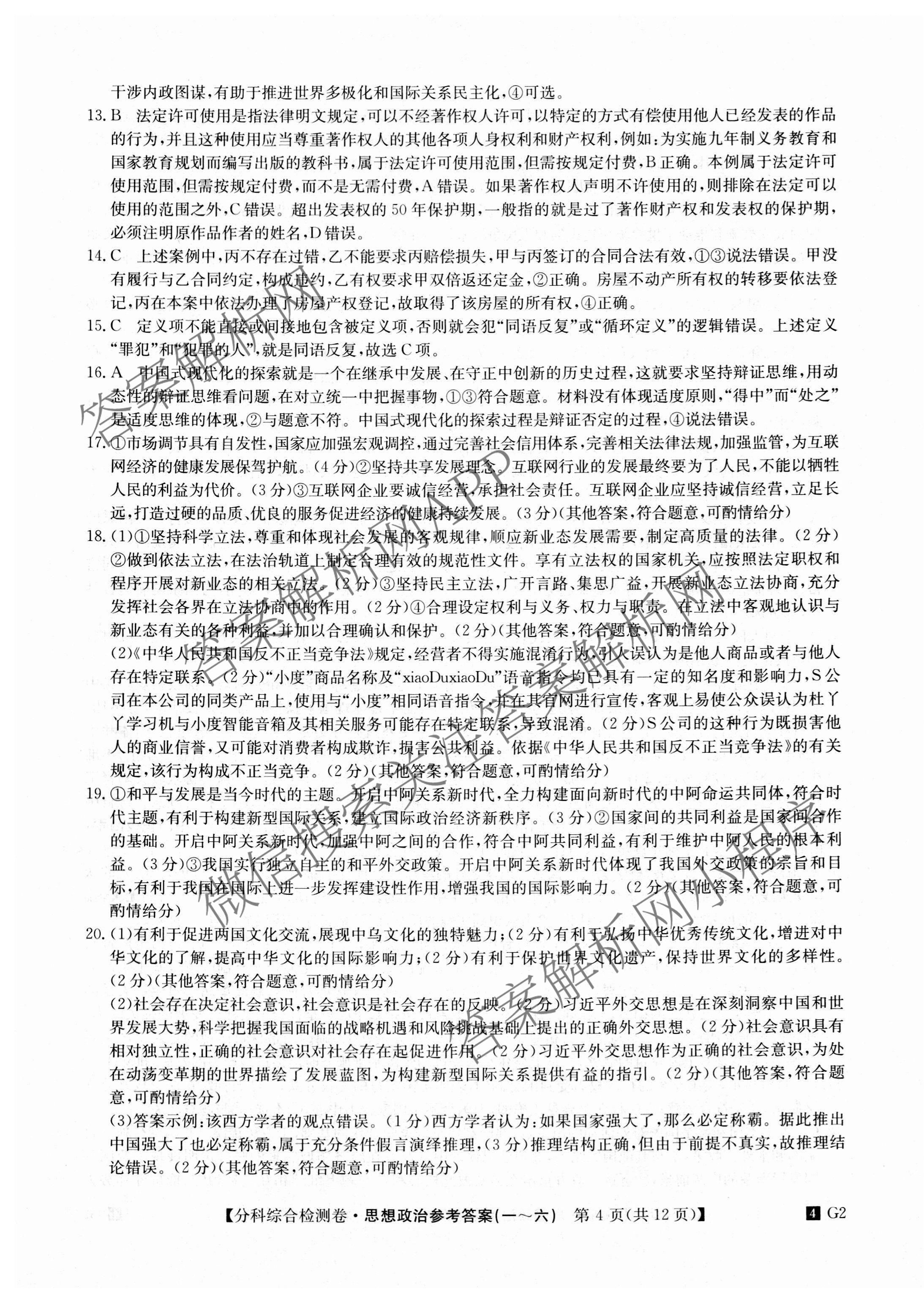 - 2024(分科综合检测卷) 政治(3 G2)(二)2答案