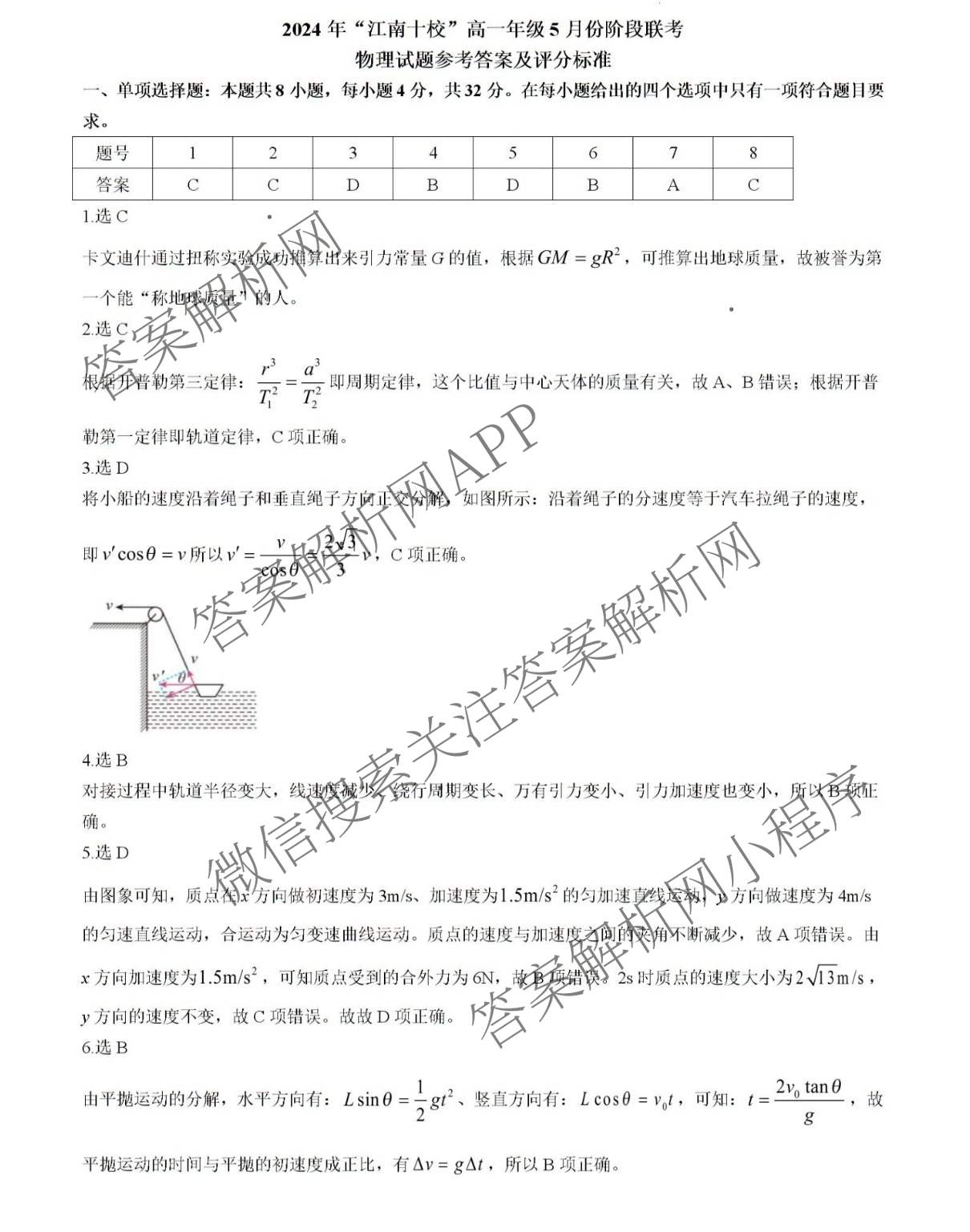 - 2024年"[江南十校]"(高一)年级5月阶段联考物理答案