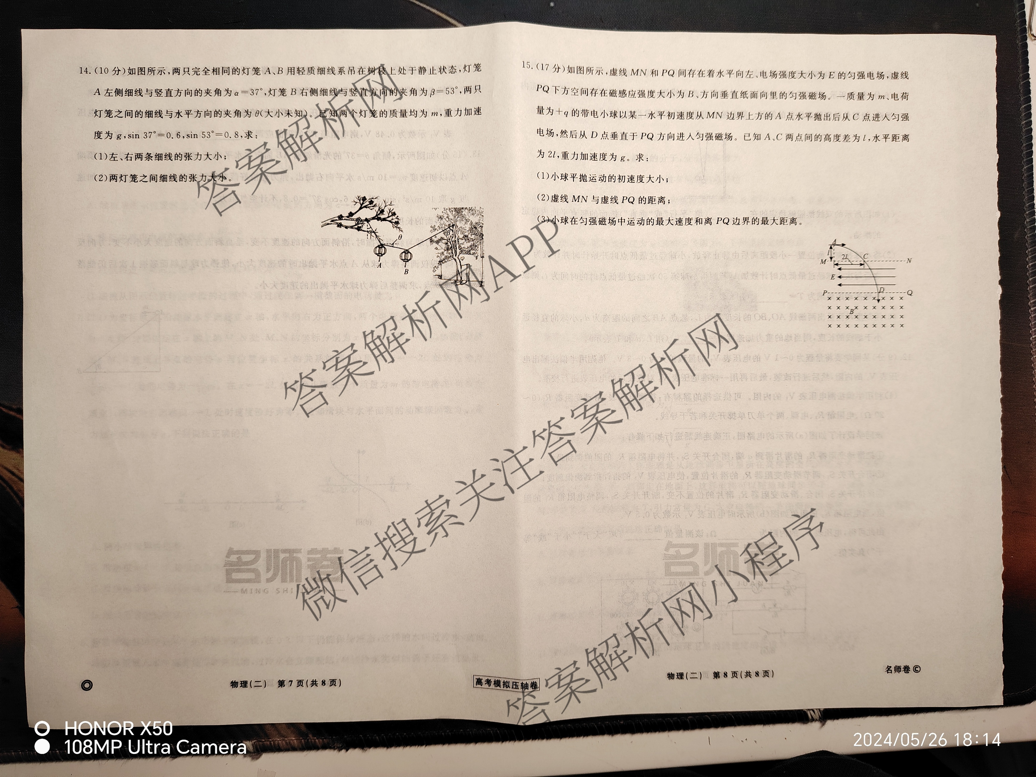 - [衡水名师卷]高考模拟压轴卷 2024年普通高中学业水平选择性考试模拟试题(二)2物理(无页脚)答案