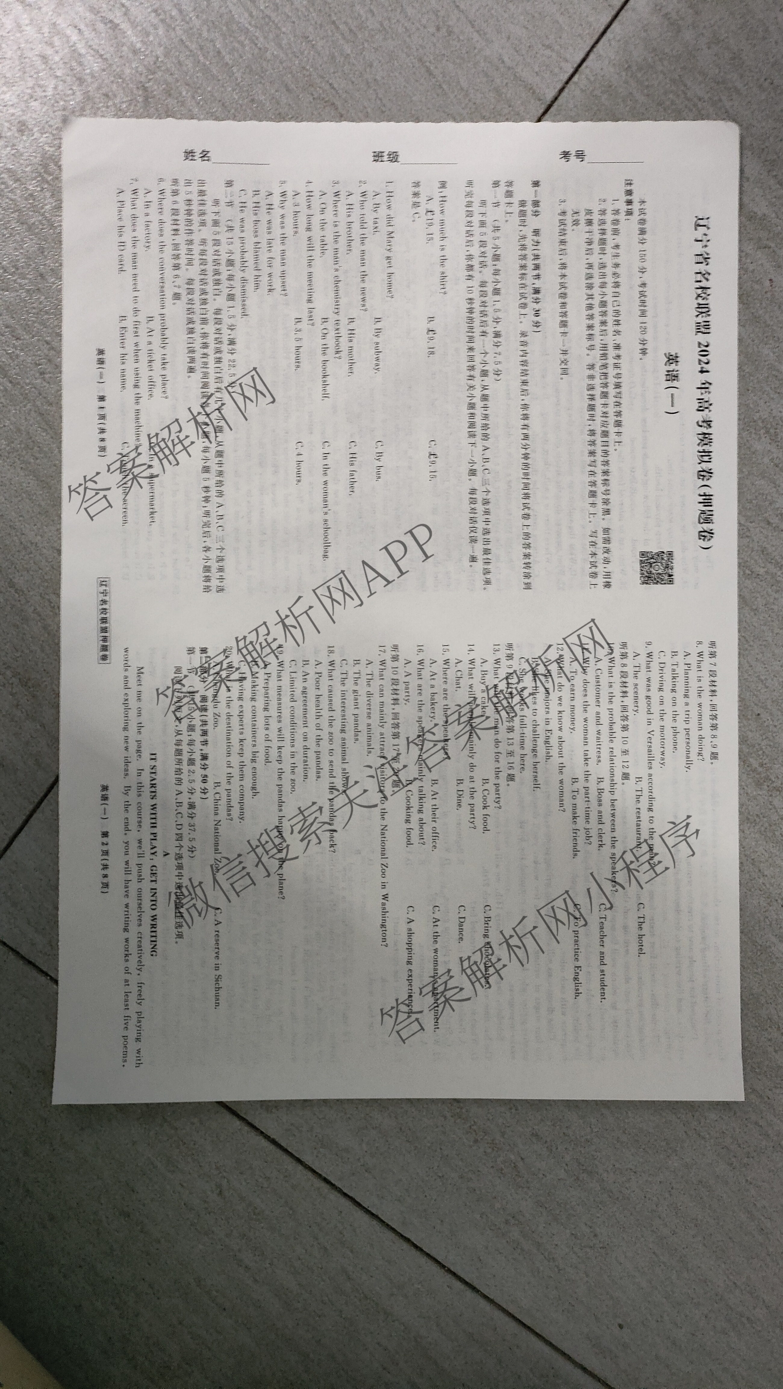 - [高三]辽宁省名校联盟2024年高考模拟卷(押题卷)(一)1英语试题