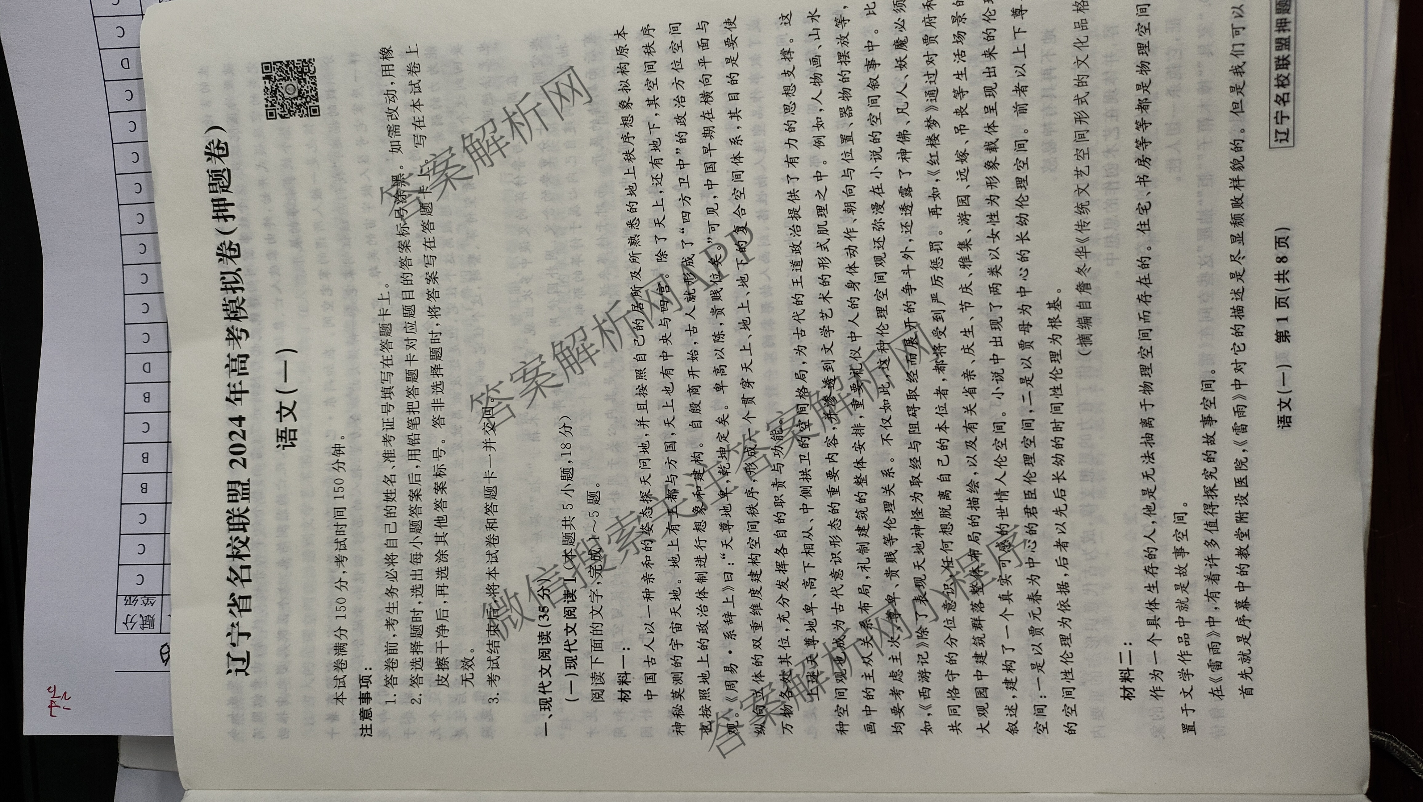 - [高三]辽宁省名校联盟2024年高考模拟卷(押题卷)(一)1语文试题