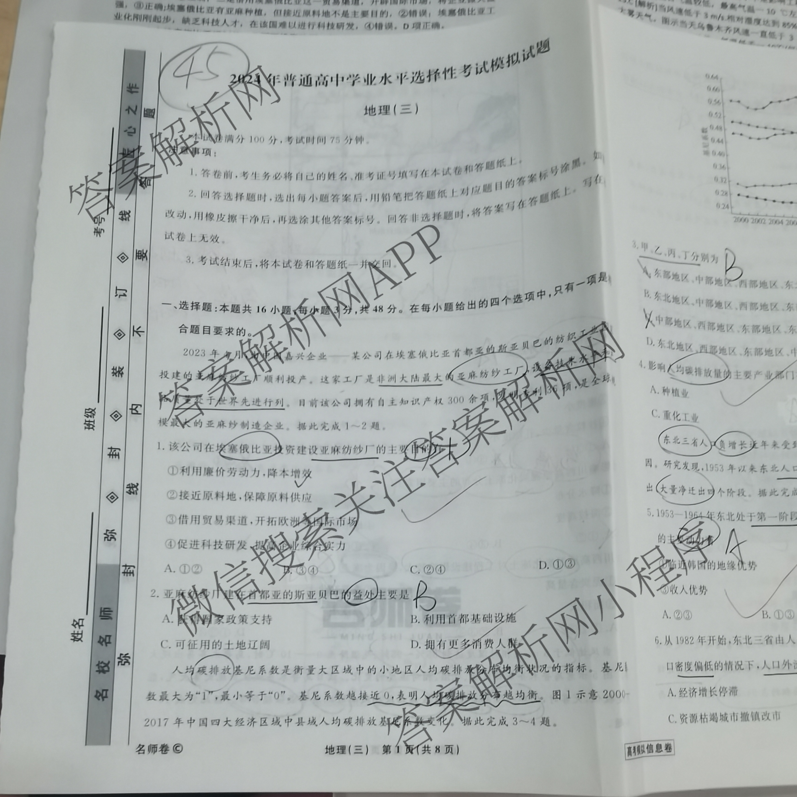 衡水名师卷高考模拟信息卷 2024年普通高等学校招生全国统一考试模拟 地理(双菱形)(三)3答案
