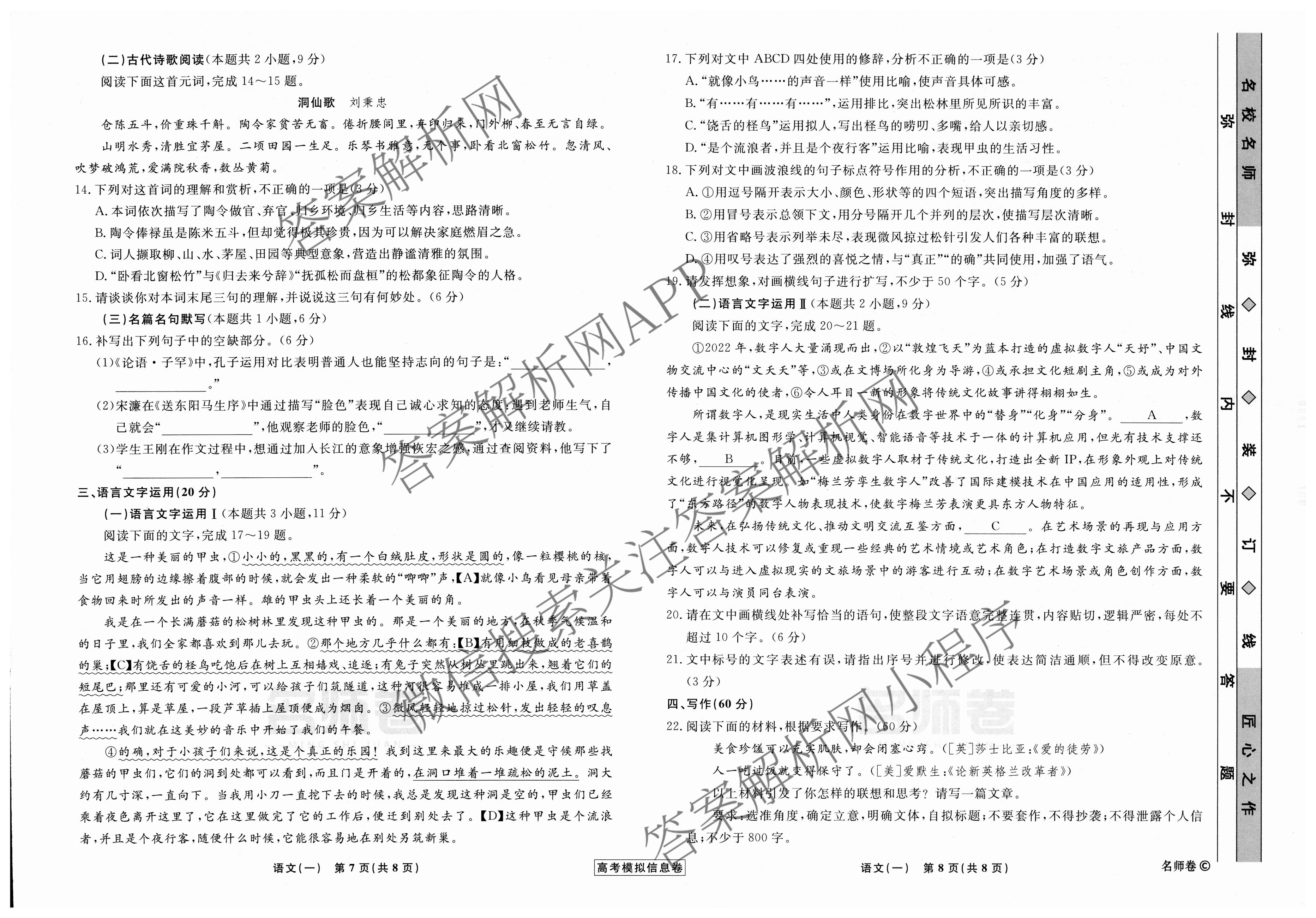 衡水名师卷·高考模拟信息卷 2024年普通高等学校招生全国统一考试模拟 语文(无页脚 老教材)(一)1试题,目前分科卷答案网已经汇总了衡水名师卷·高考模拟信息卷 2024年普通高等学校招生全国统一考试模拟 语文(无页脚 老教材)(一)1试题的各科答案和试卷,获取更多衡水名师卷答案解析,请在关注本站。