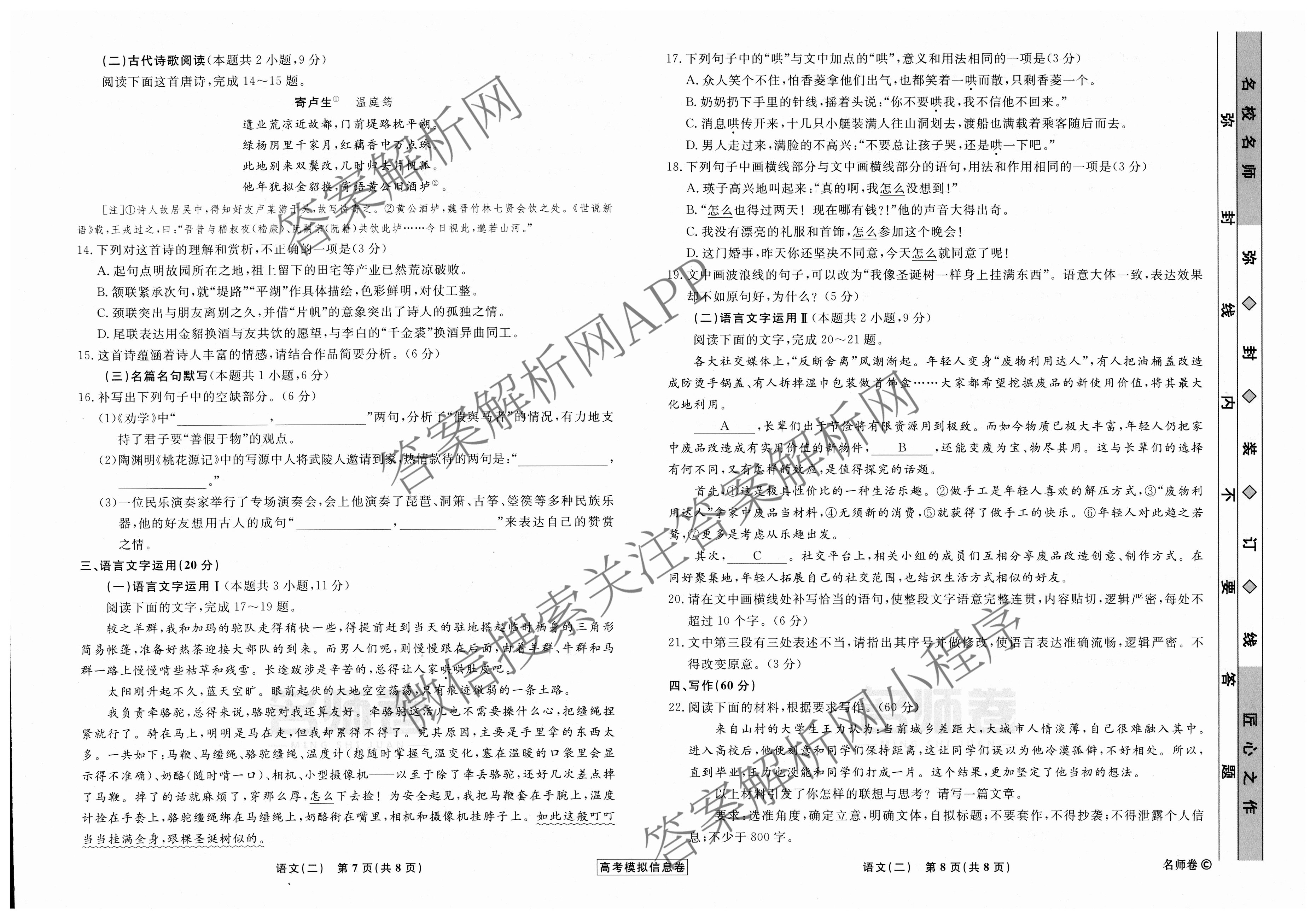 衡水名师卷·高考模拟信息卷 2024年普通高等学校招生全国统一考试模拟 语文(无页脚 老教材)(二)2试题,目前分科卷答案网已经汇总了衡水名师卷·高考模拟信息卷 2024年普通高等学校招生全国统一考试模拟 语文(无页脚 老教材)(二)2试题的各科答案和试卷,获取更多衡水名师卷答案解析,请在关注本站。