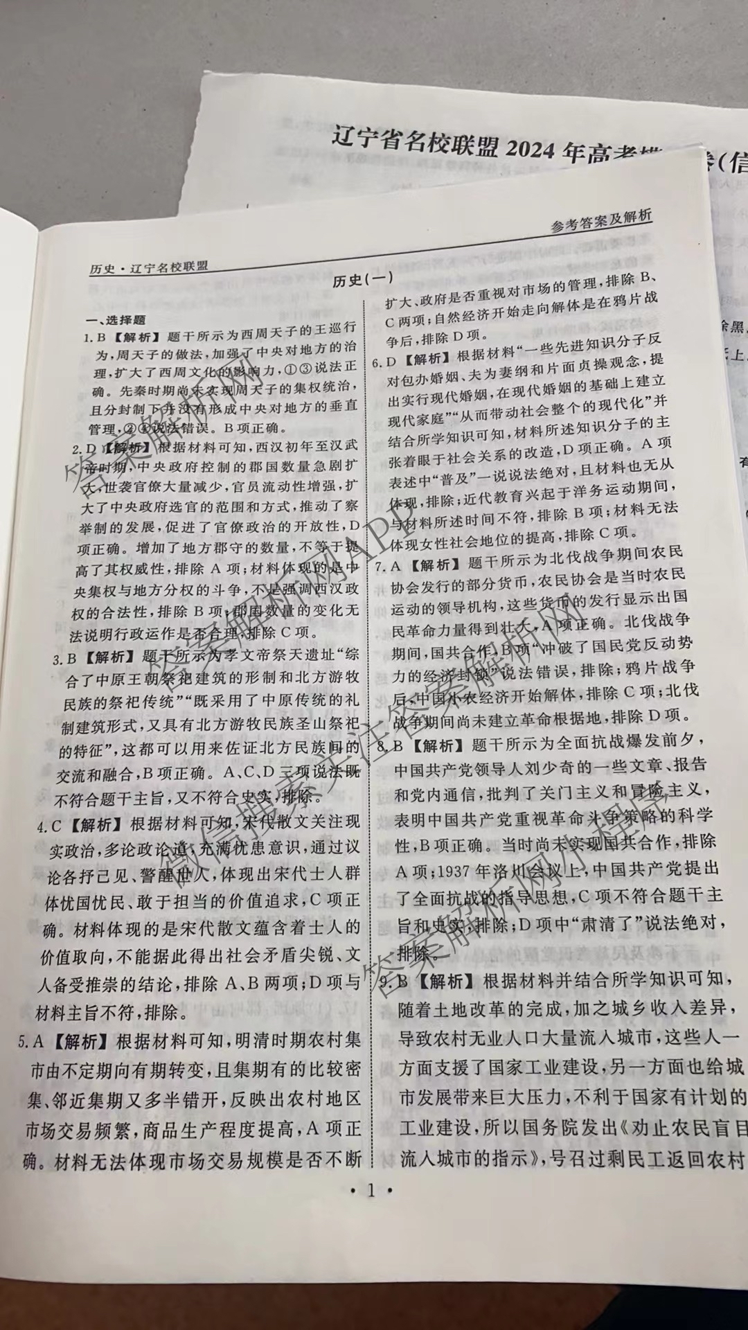 - [高三]辽宁省名校联盟2024年高考模拟卷(信息卷)(一)历史答案
