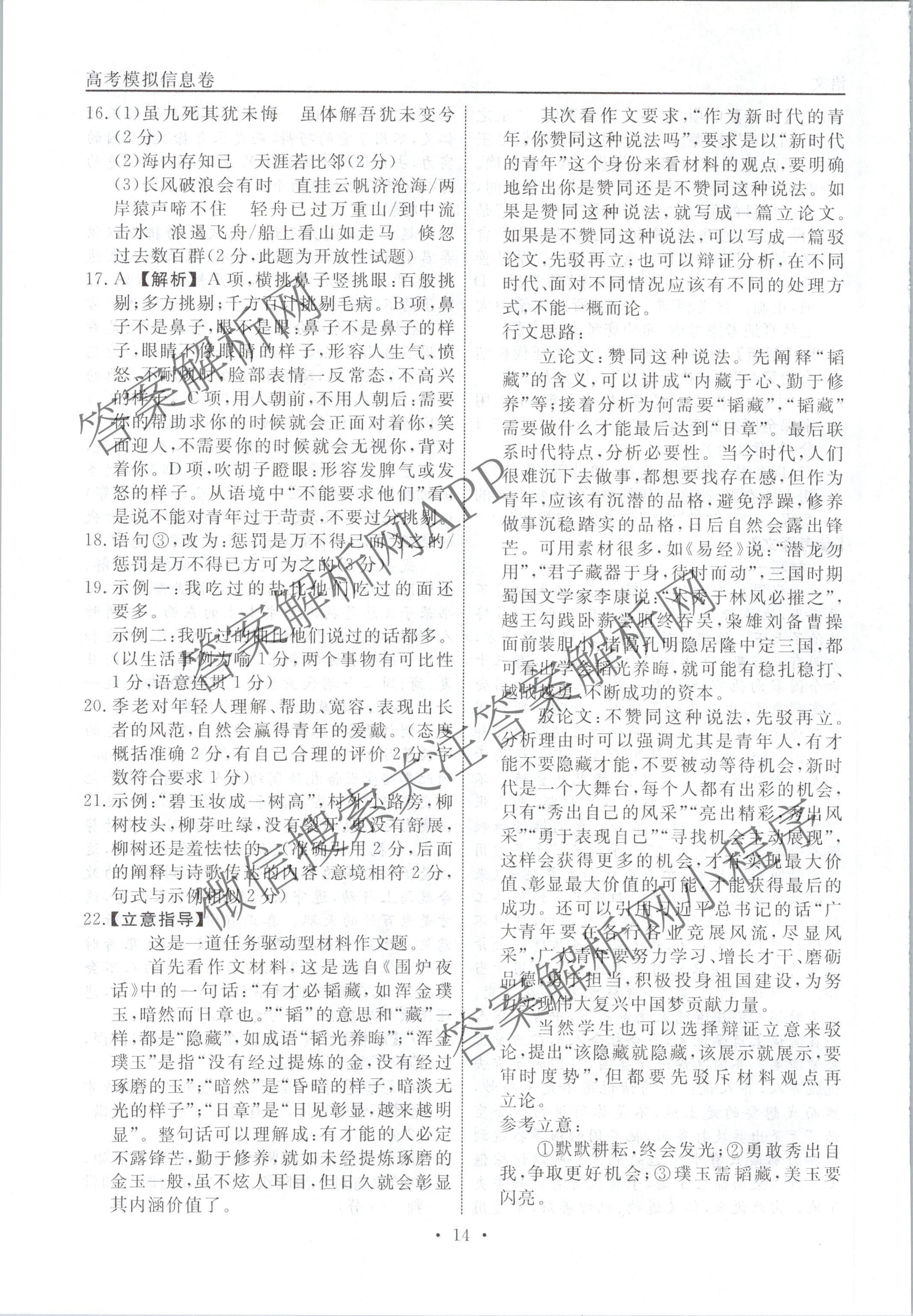衡水名师卷高考模拟信息卷 2024年普通高等学校招生全国统一考试模拟 语文(无页脚 老教材)(六)6答案