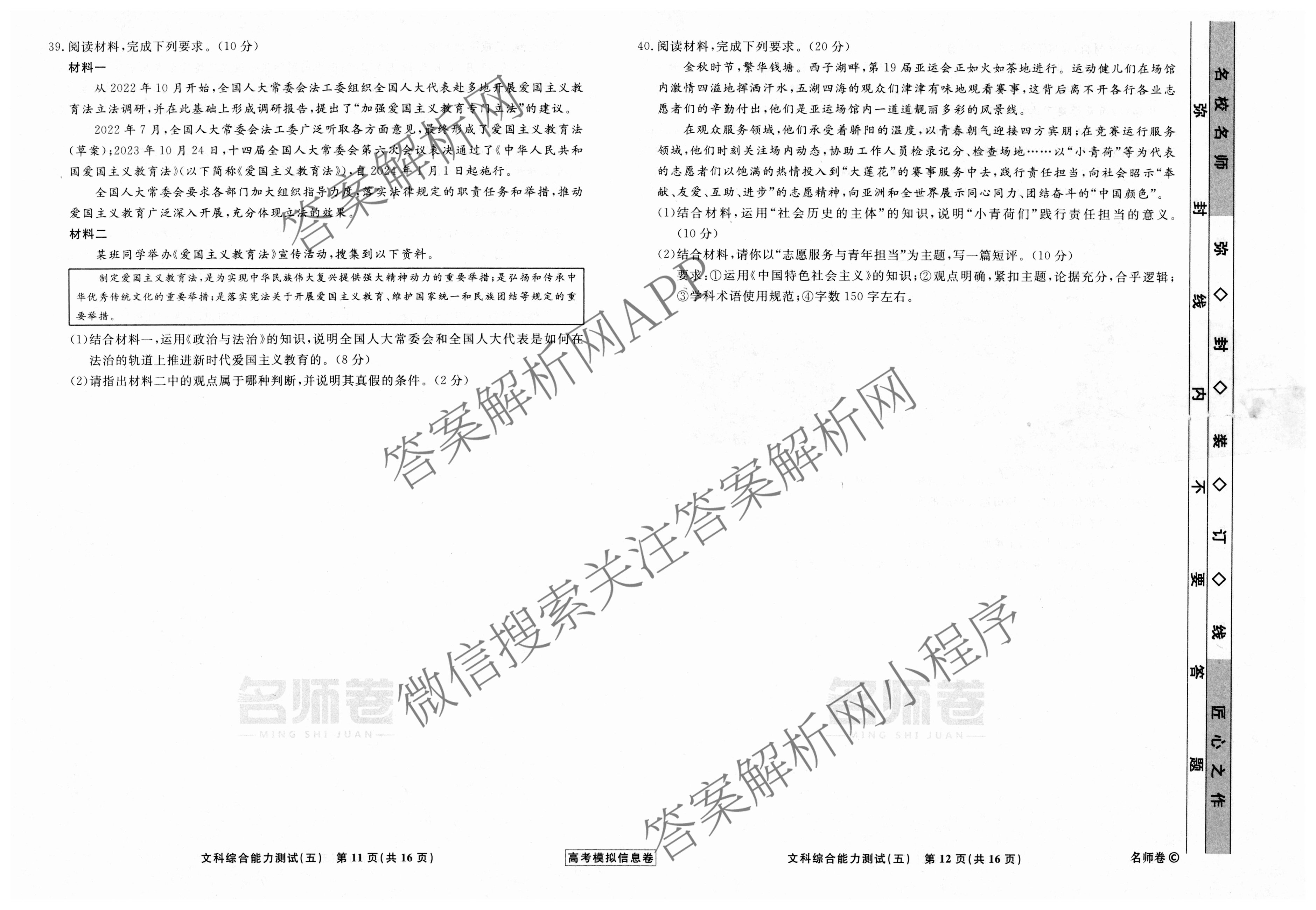 衡水名师卷高考模拟信息卷2024年普通高等学校招生全国统一考试模拟 文综(空心◇)(五)5试题