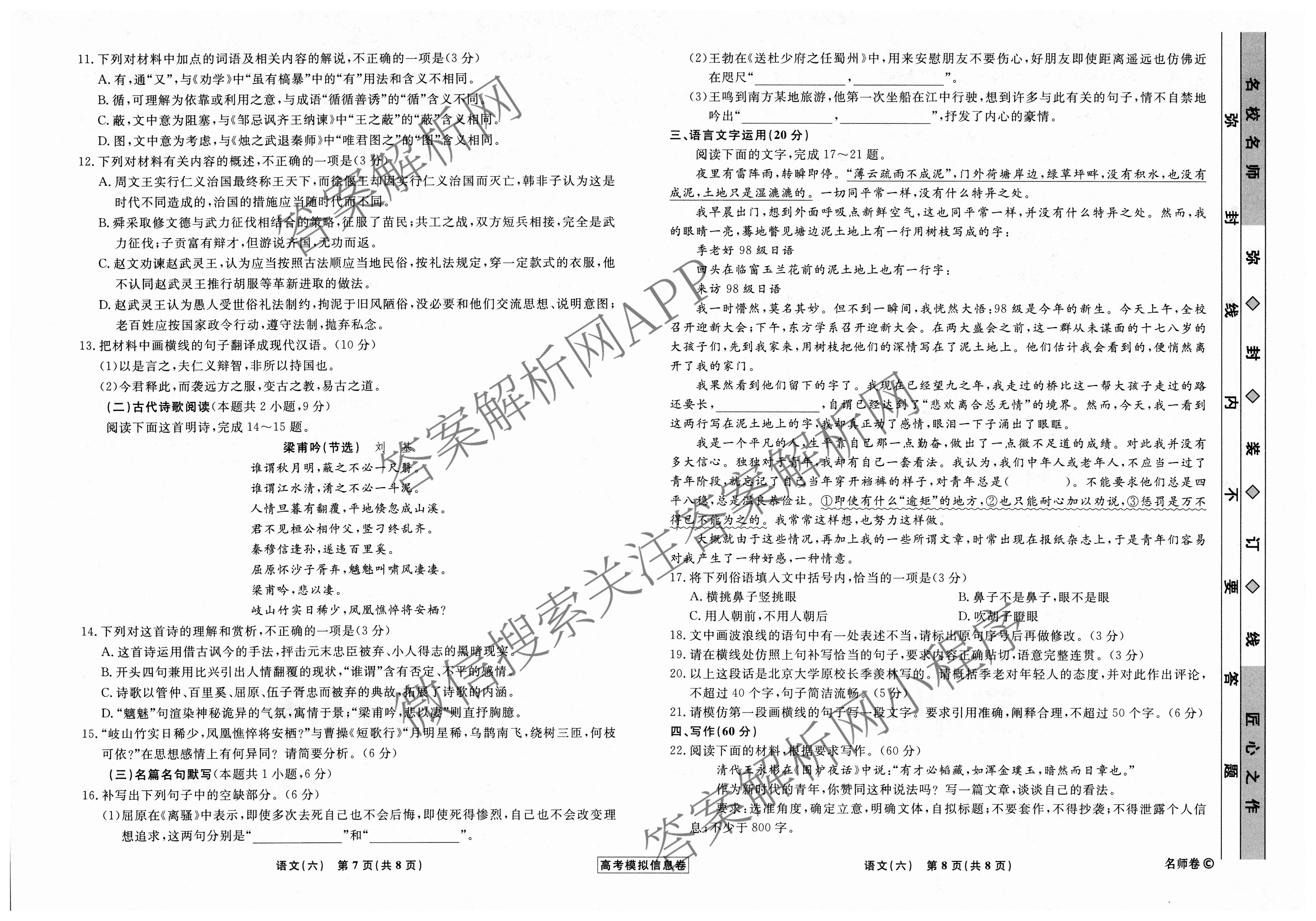衡水名师卷高考模拟信息卷 2024年普通高等学校招生全国统一考试模拟 语文(无页脚 老教材)(六)6试题