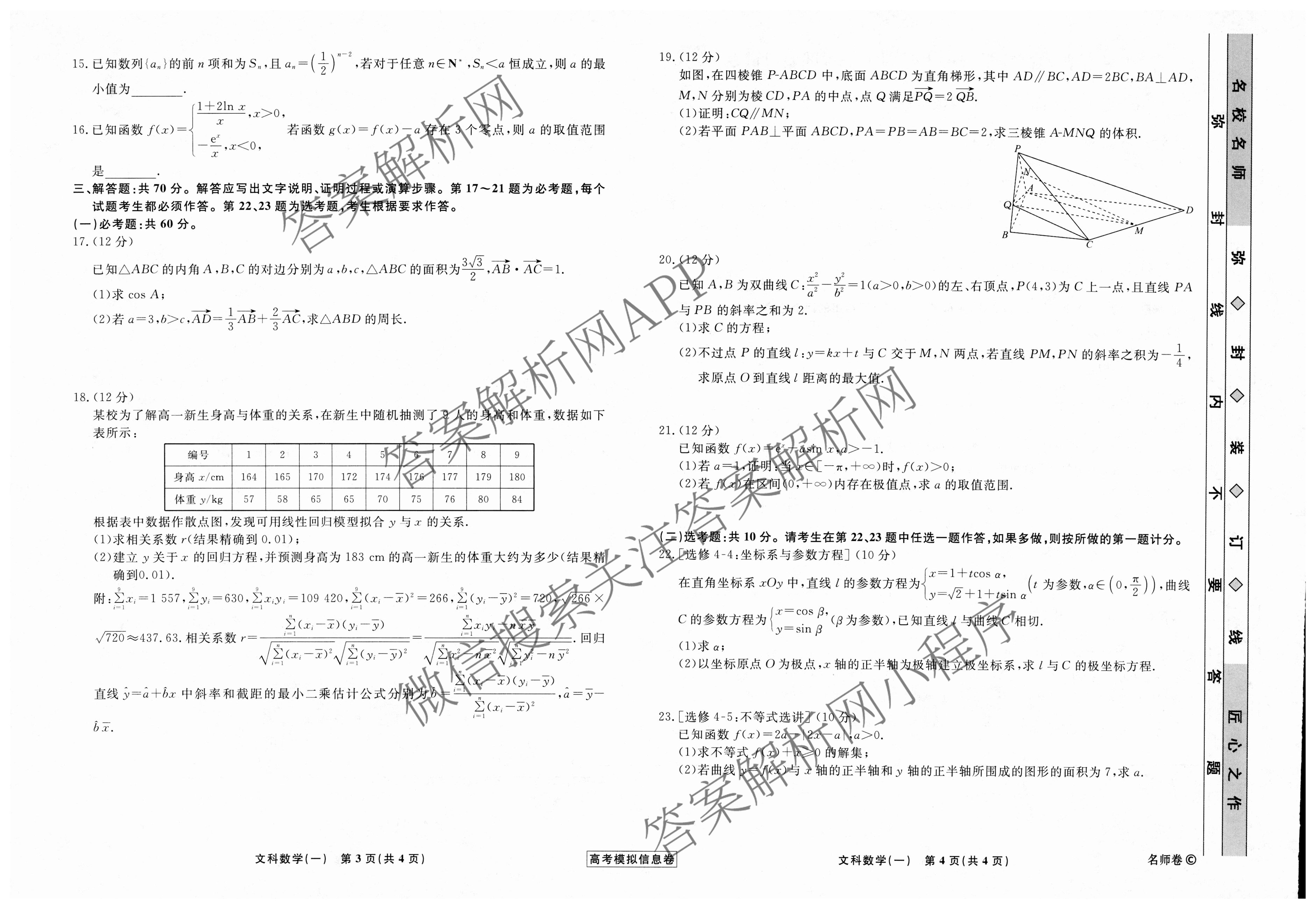 - (高三)(衡水名师卷)·高考模拟信息卷 2024年普通高等学校招生全国统一考试模拟试题 文数(老教材)(一)1答案