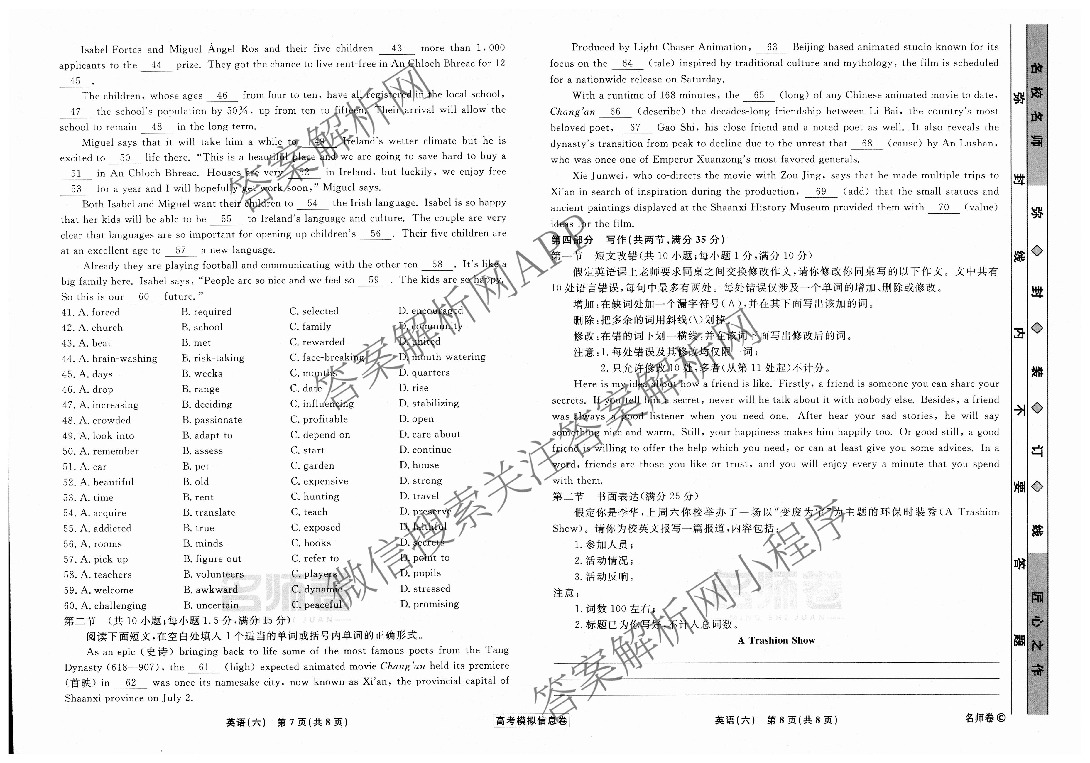 衡水名师卷高考模拟信息卷2024年普通高等学校招生全国统一考试模拟英语(实心◇老高考)(六)6试题