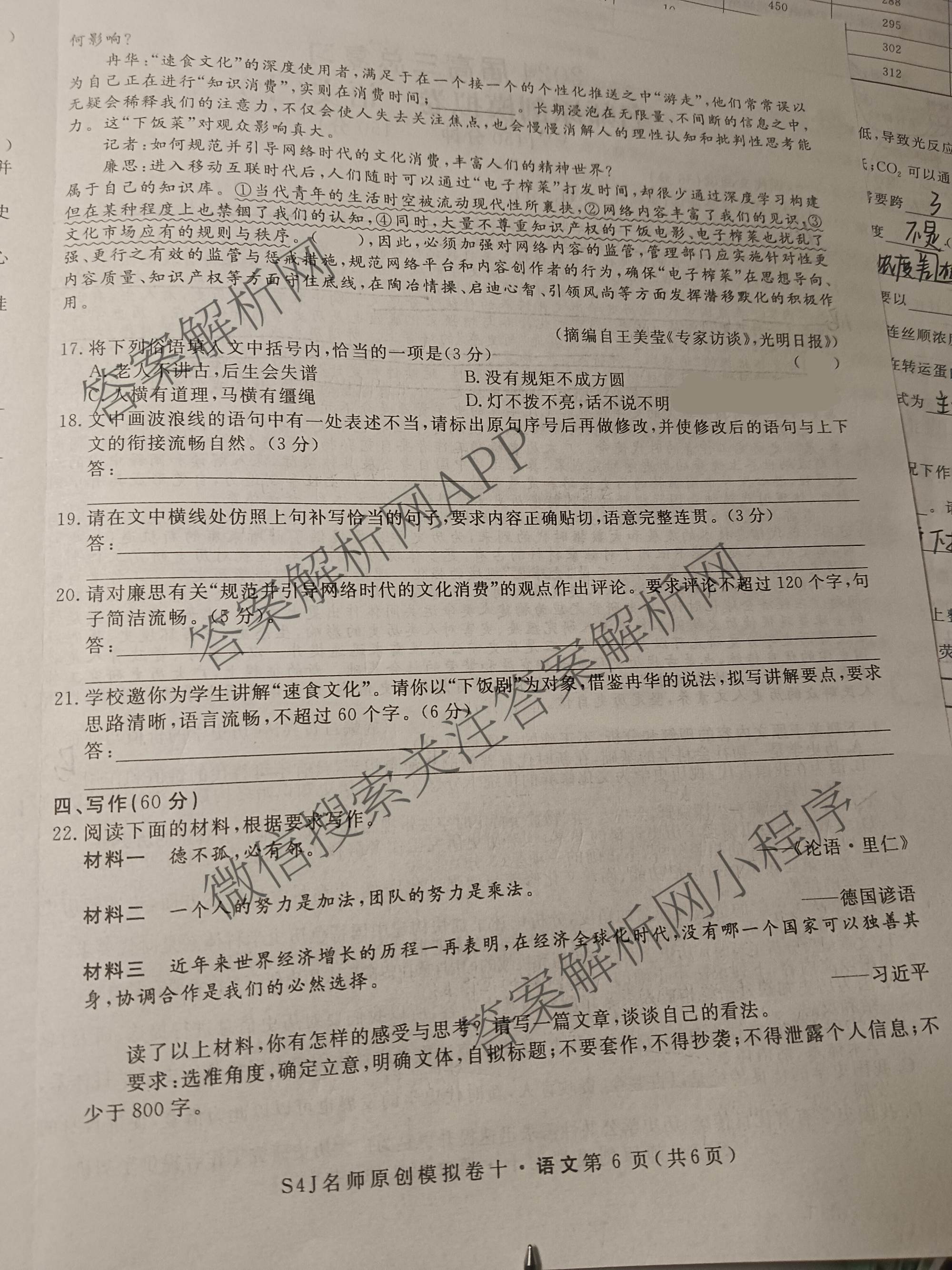 2024届高三总复习·名师原创模拟(十)10语文(S4J)试题,目前分科卷答案网已经汇总了2024届高三总复习·名师原创模拟(十)10语文(S4J)试题的各科答案和试卷,获取更多高三总复习·名师原创模拟答案解析,请在关注本站。