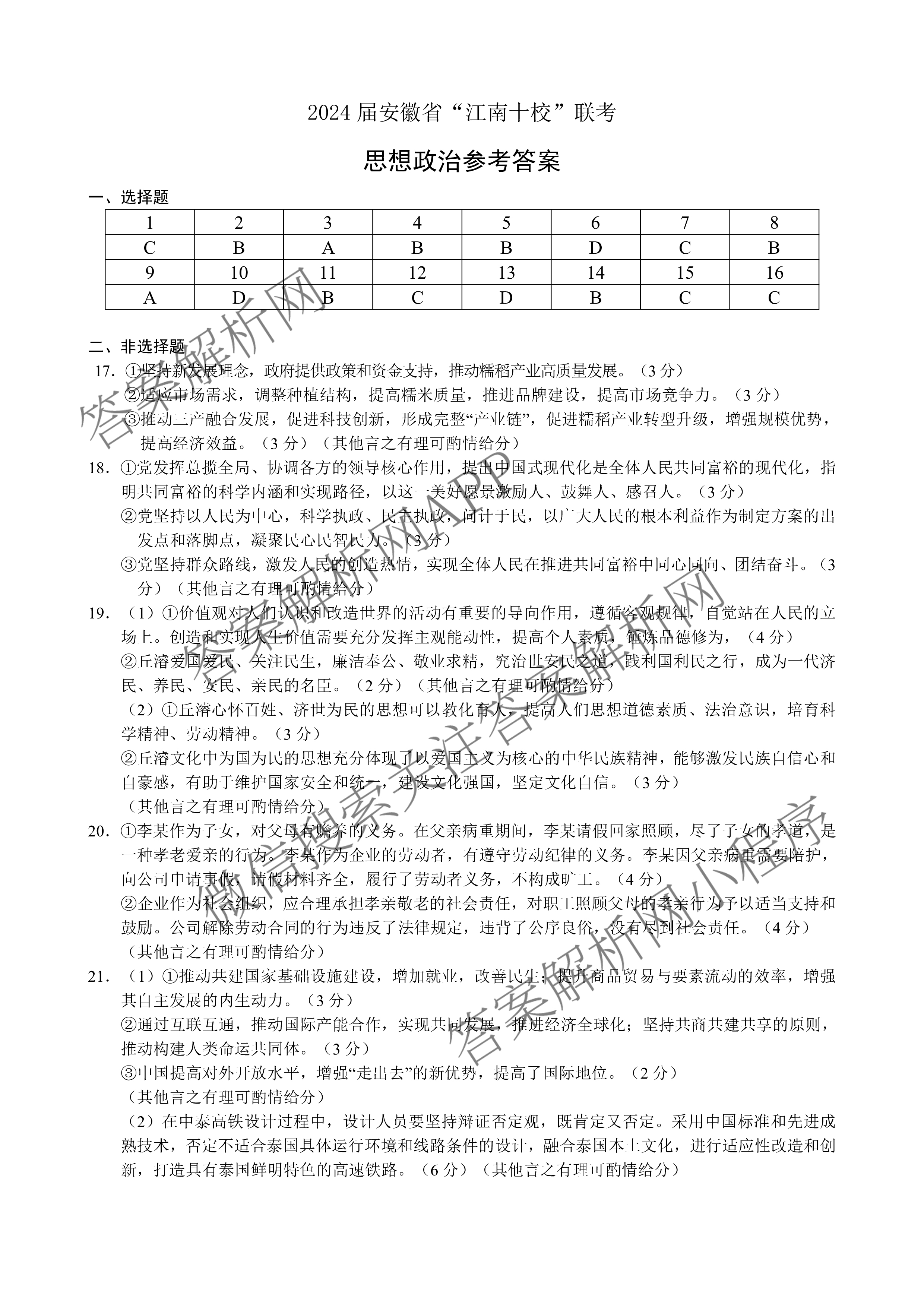 - 2024届安徽省"江南十校"联考政治答案
