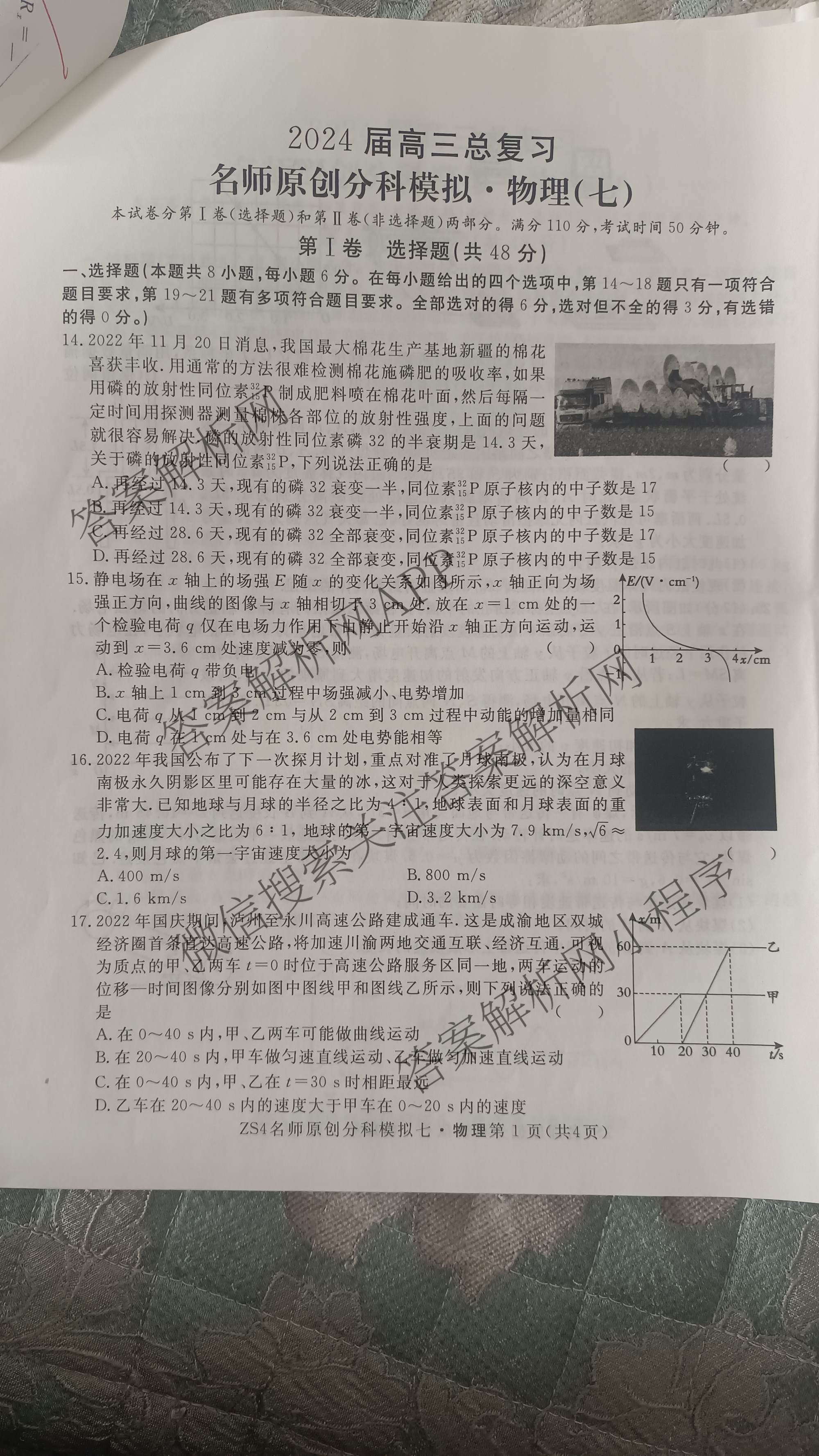 2024届高三总复习·名师原创分科模拟 物理(ZS4)(七)7试题,目前分科卷答案网已经汇总了2024届高三总复习·名师原创分科模拟 物理(ZS4)(七)7试题的各科答案和试卷,获取更多高三总复习·名师原创模拟答案解析,请在关注本站。