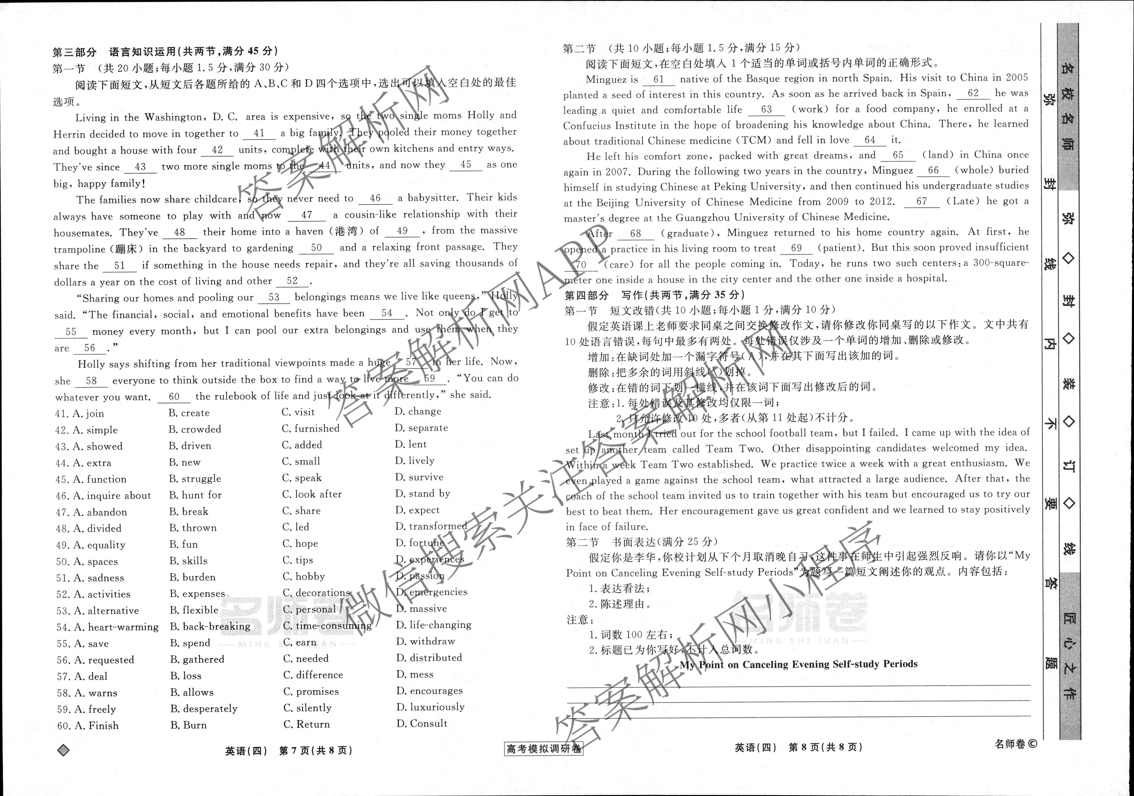 - [高三][衡水名师卷]高考模拟调研卷 2024年普通高等学校招生全国统一考试模拟试题 英语(空心◇)(四)4答案