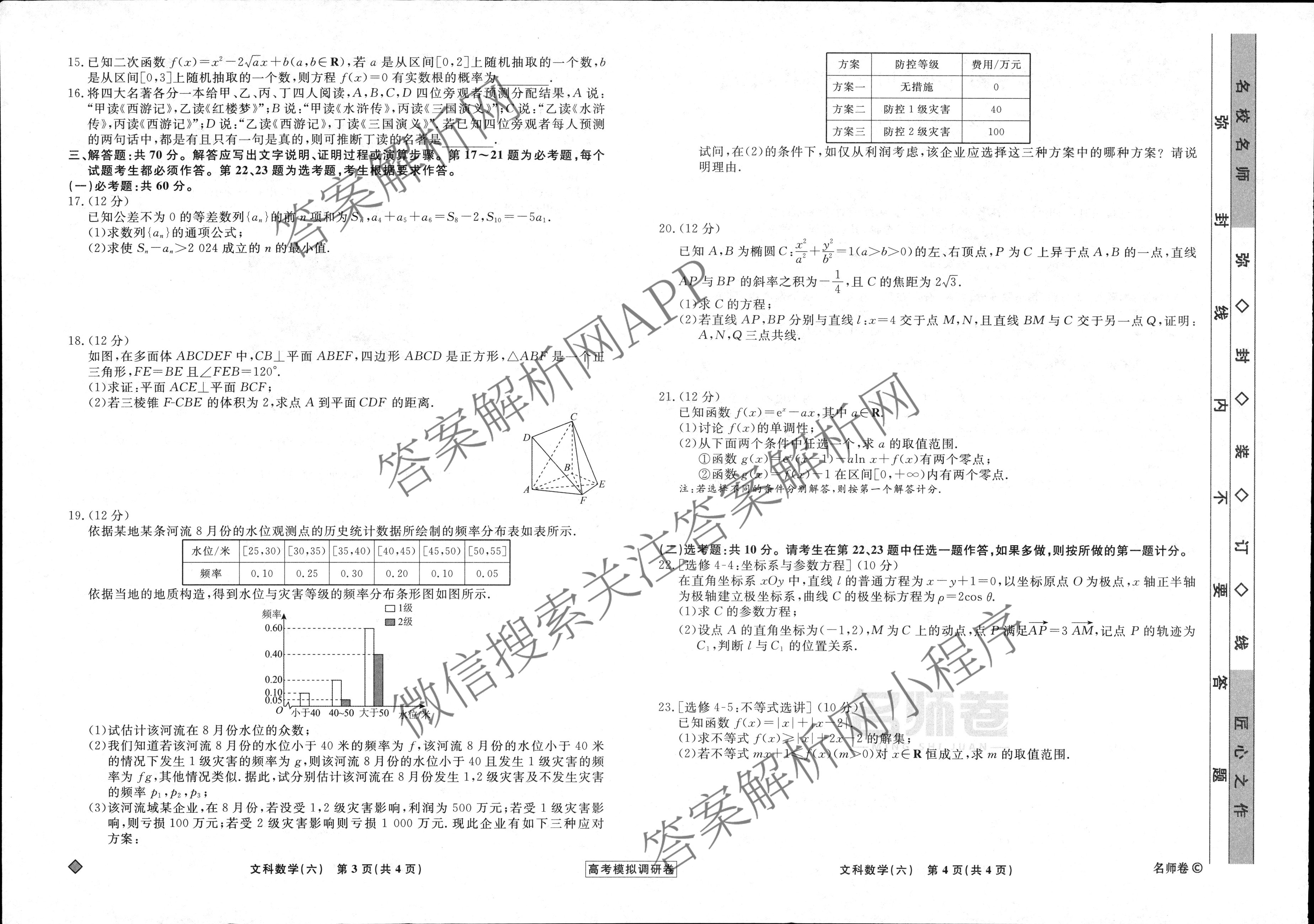 - [高三][衡水名师卷]高考模拟调研卷 2024年普通高等学校招生全国统一考试模拟试题 文数(实心◇)(六)6答案