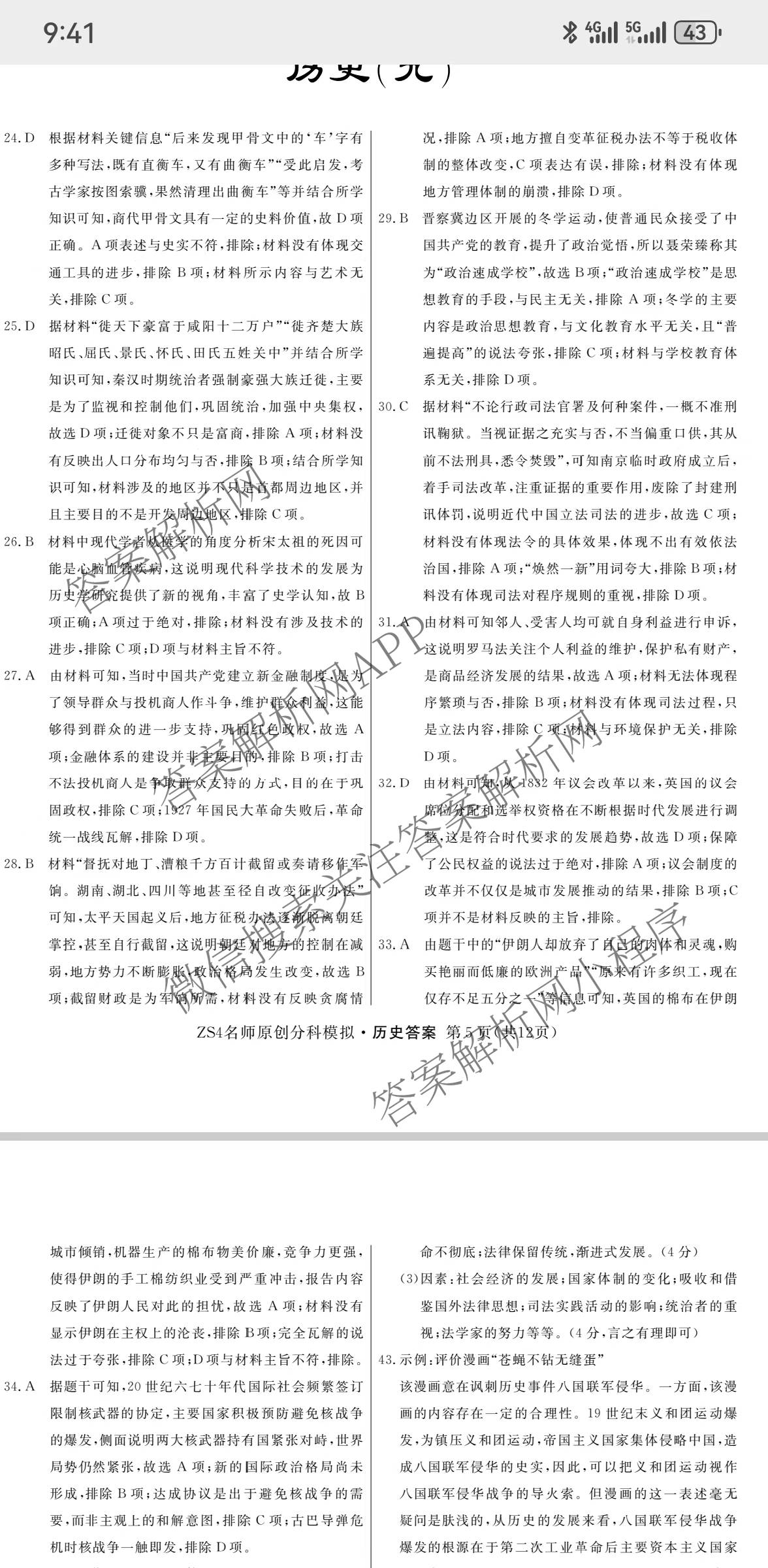 2024届高三总复习名师原创分科模拟(九)9历史(ZS4)答案