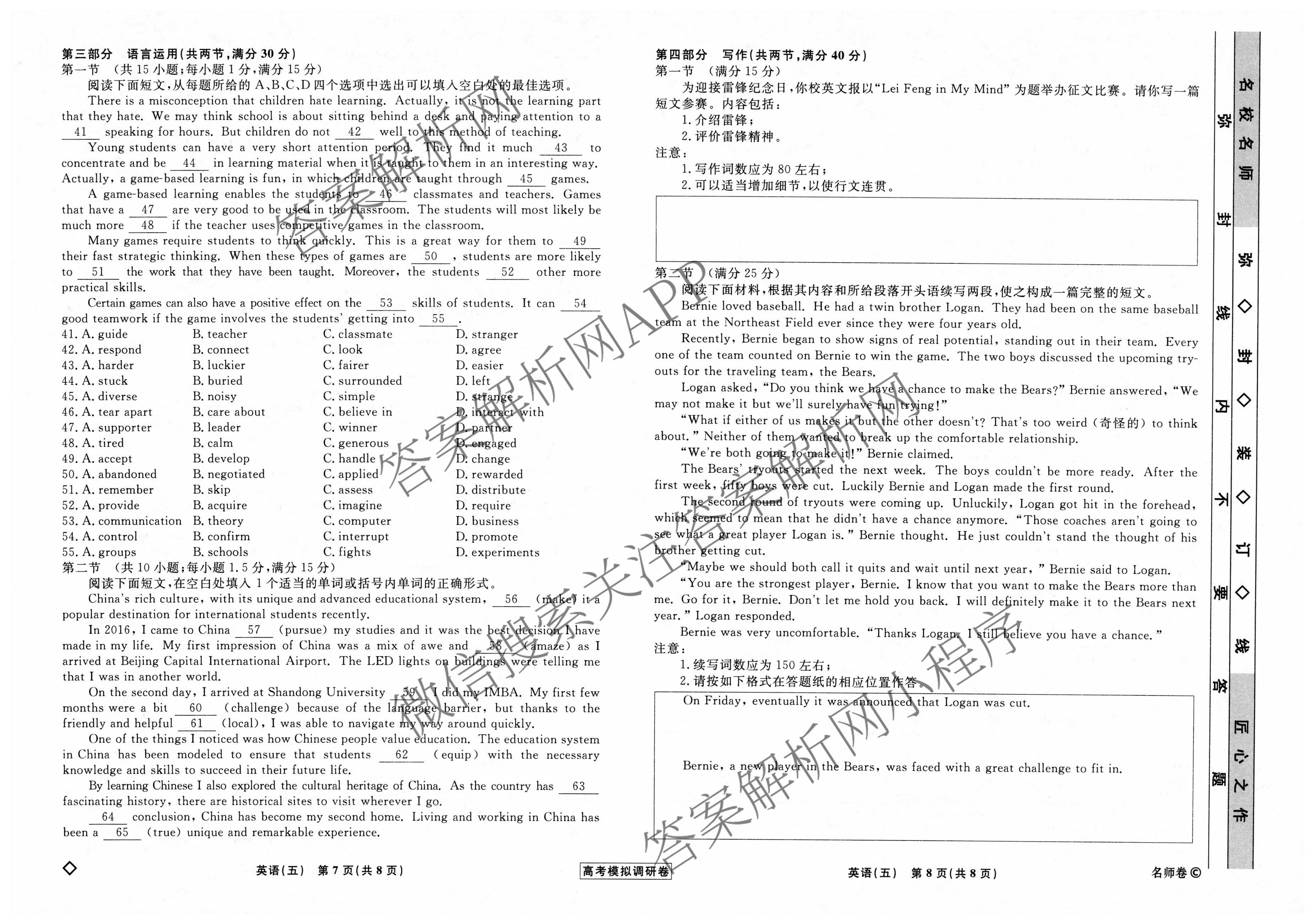 [高三][衡水名师卷]·高考模拟调研卷 2024年普通高等学校招生全国统一考试模拟试题 英语(空心◇)(五)5试题
