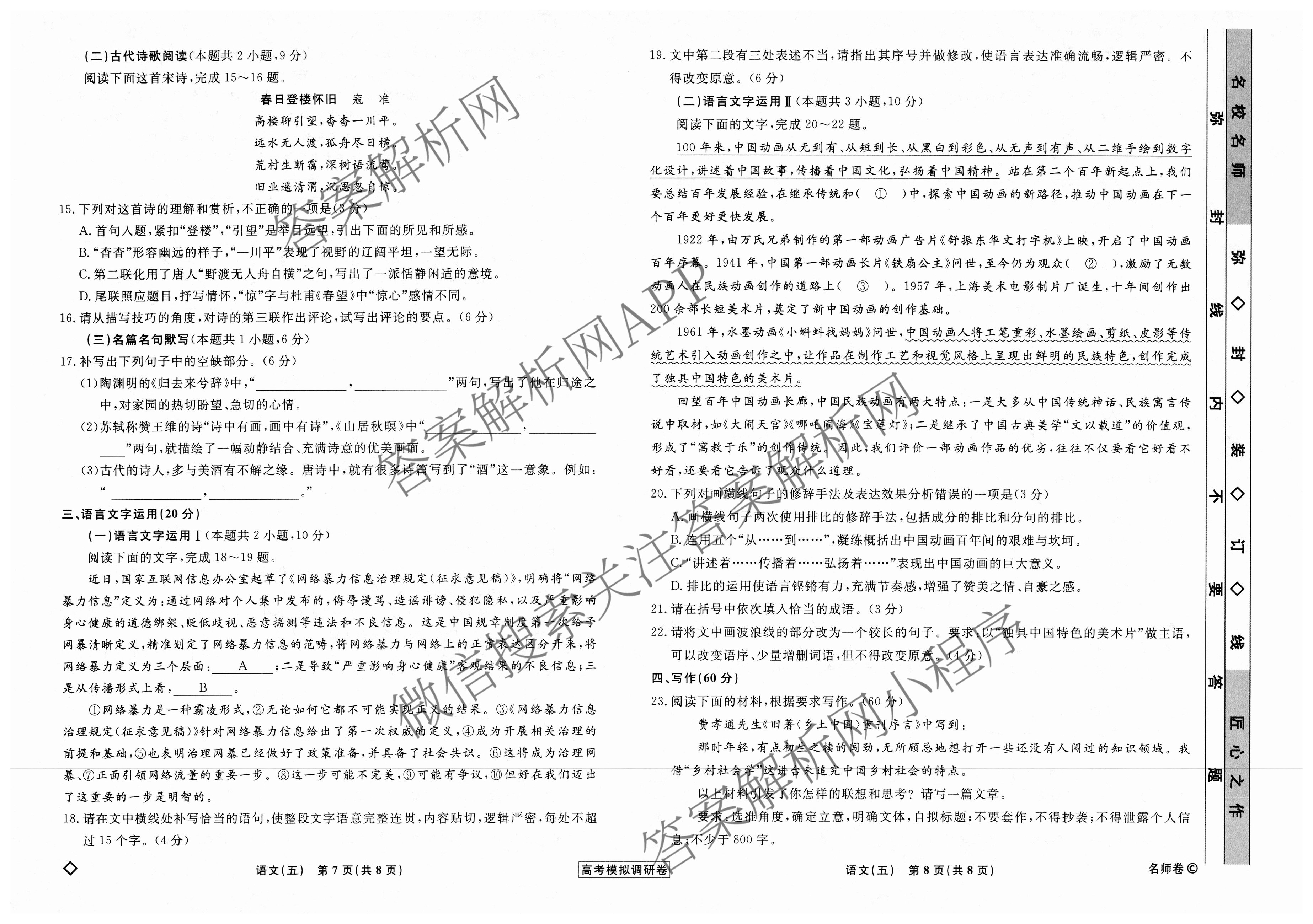 [高三][衡水名师卷]·高考模拟调研卷2024年普通高等学校招生全国统一考试模拟试题 语文(空心◇)(五)5试题
