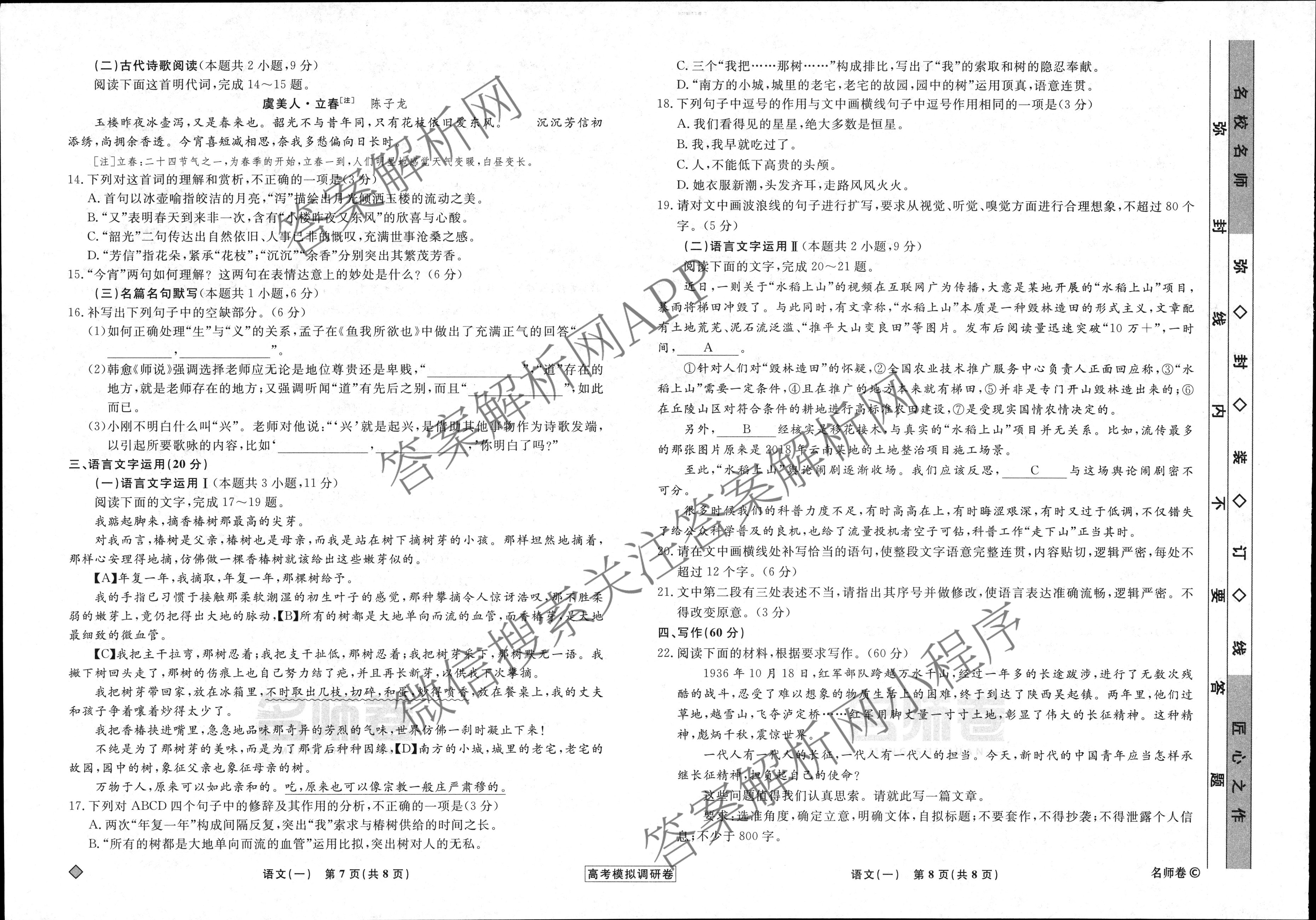 - (衡水名师卷)高考模拟调研卷2024年普通高等学校招生全国统一考试模拟试题 语文(空心◇)(一)1答案