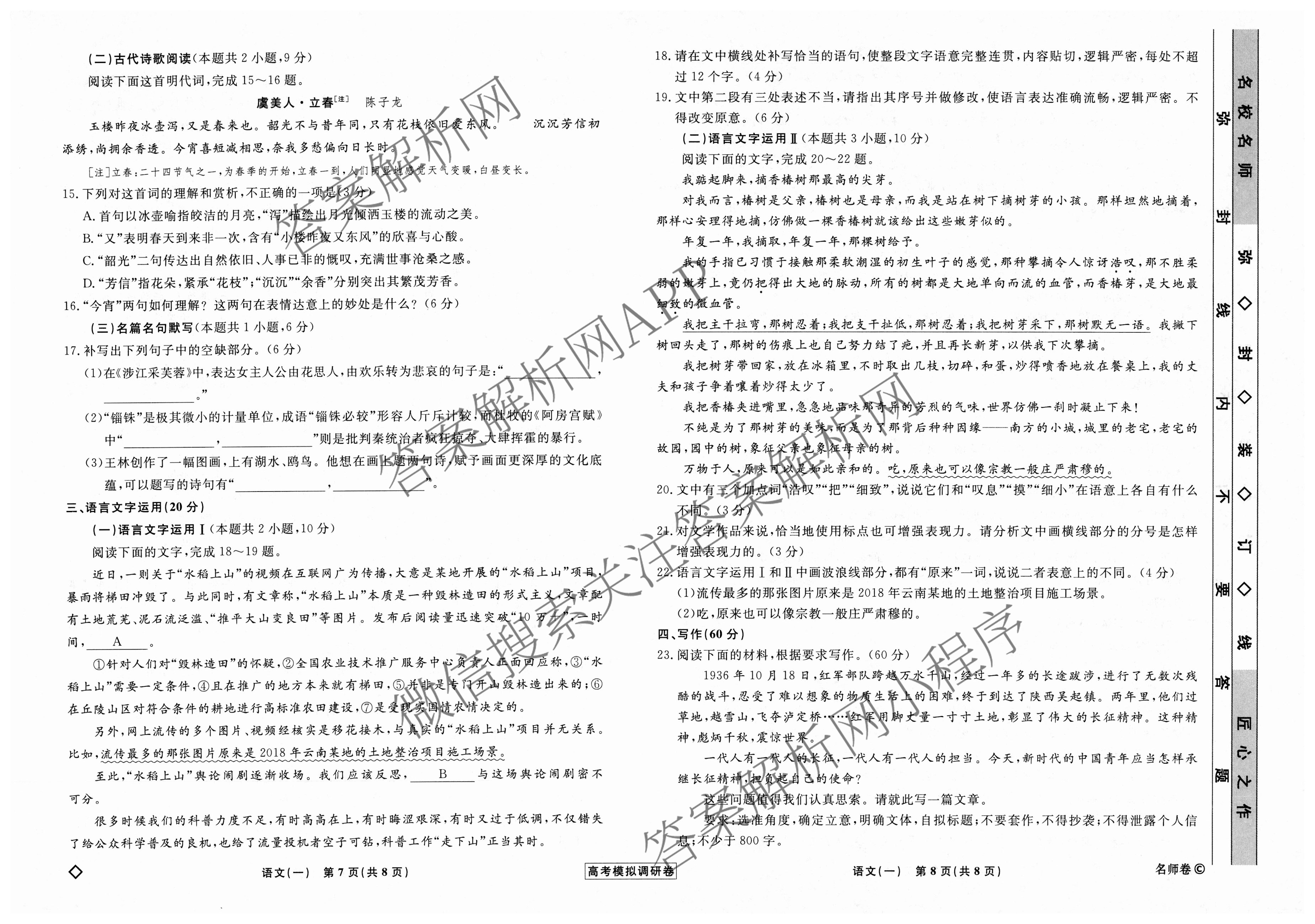 - (衡水名师卷)高考模拟调研卷2024年普通高等学校招生全国统一考试模拟试题 语文(空心◇)(一)1答案