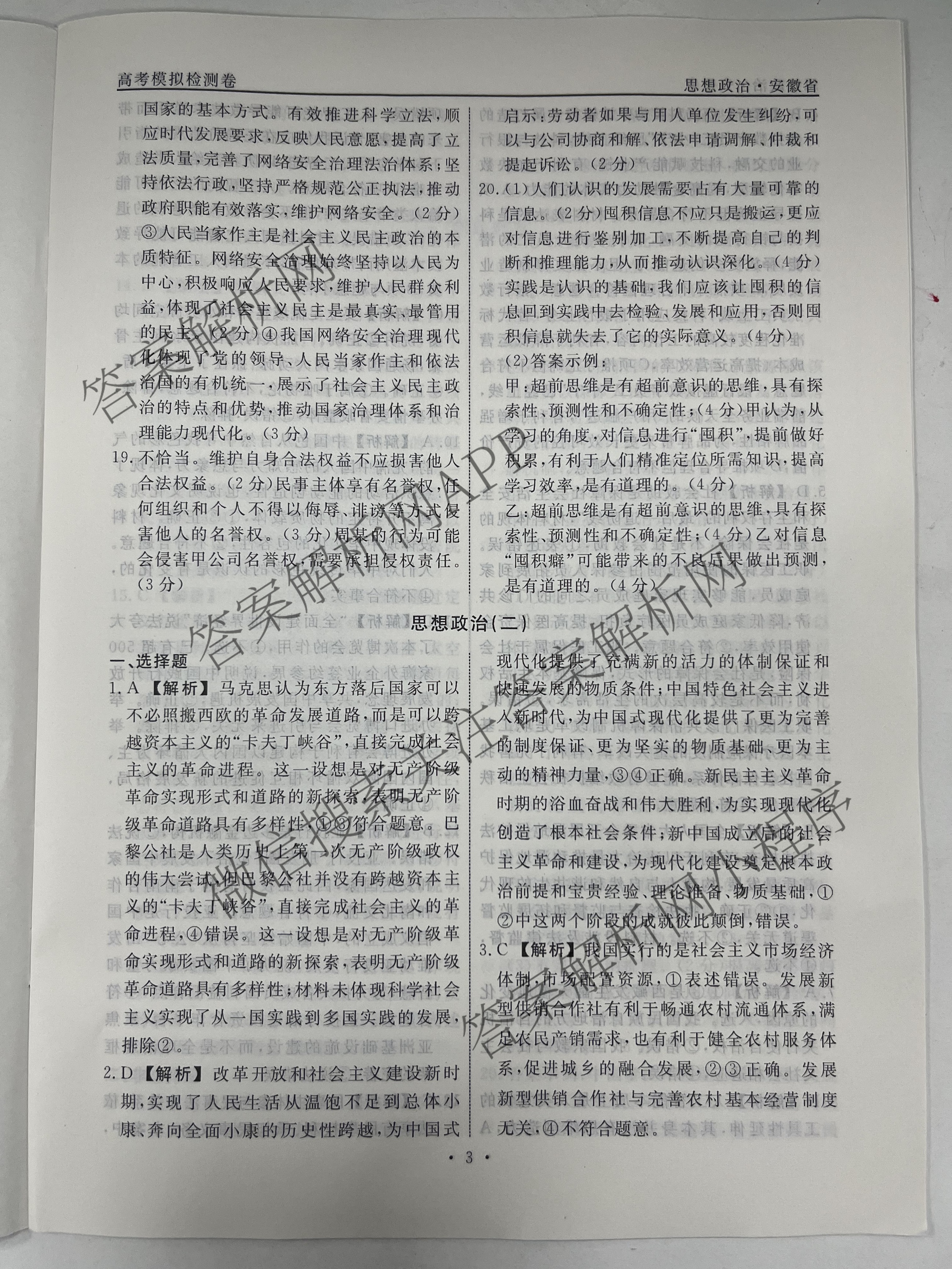 (衡水名师卷)高考模拟检测卷 安徽省2024年普通高等学校招生全国统一考试模拟试题 政治(一)1答案