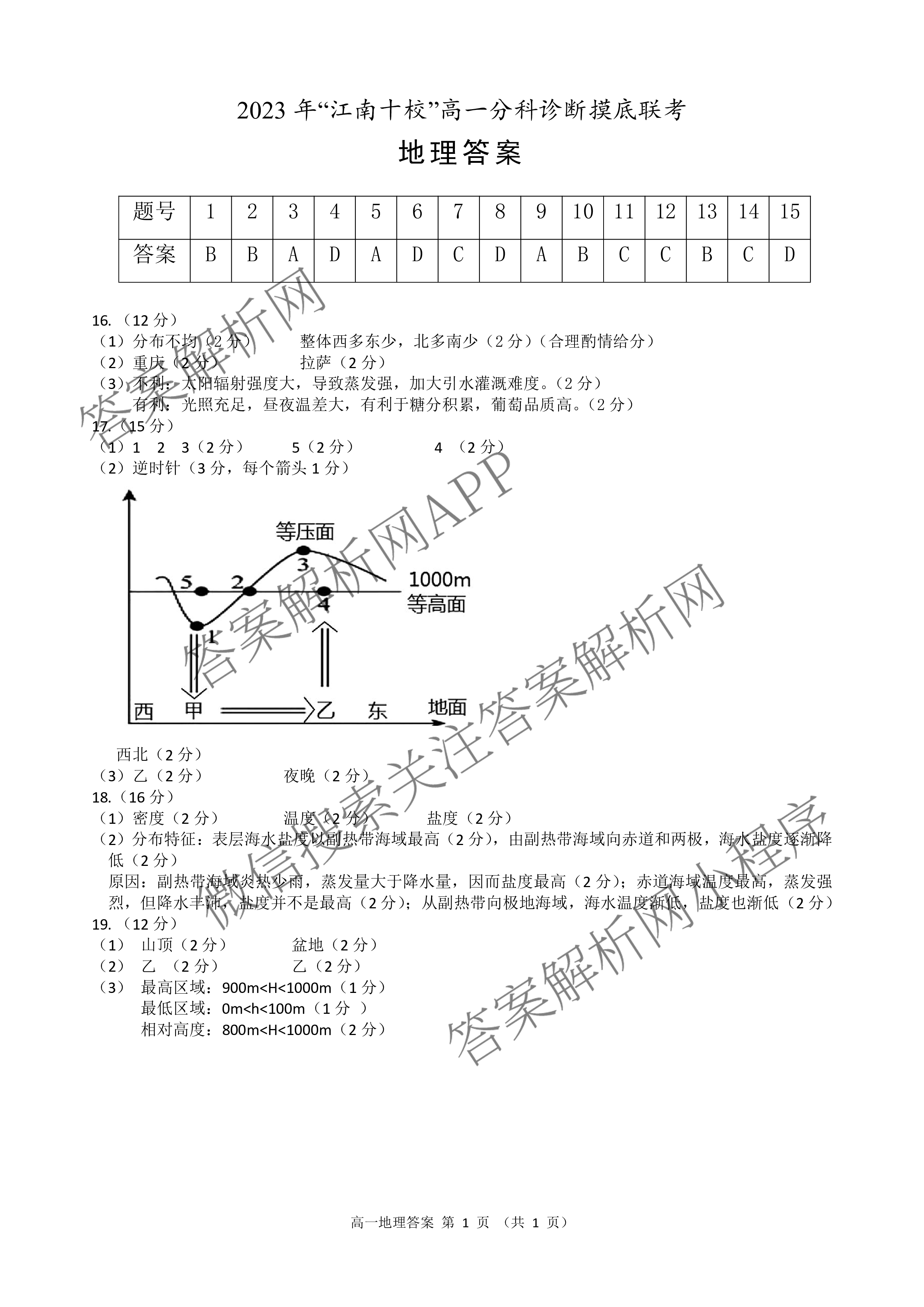 (高一)2023年[江南十校]分科诊断摸底联考地理答案