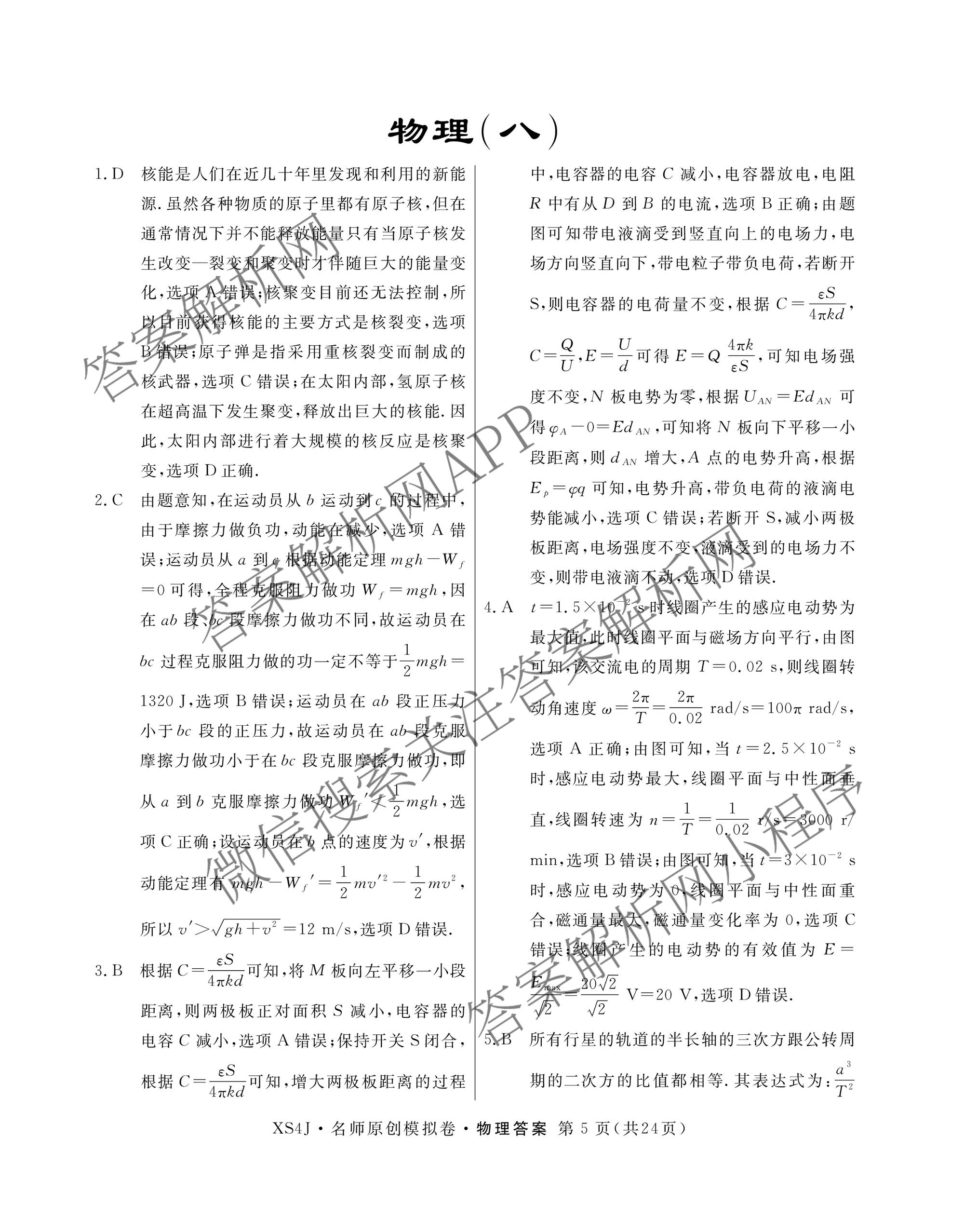 - 2024届[高三]总复习名师原创分科模拟(八)8物理(S4)答案