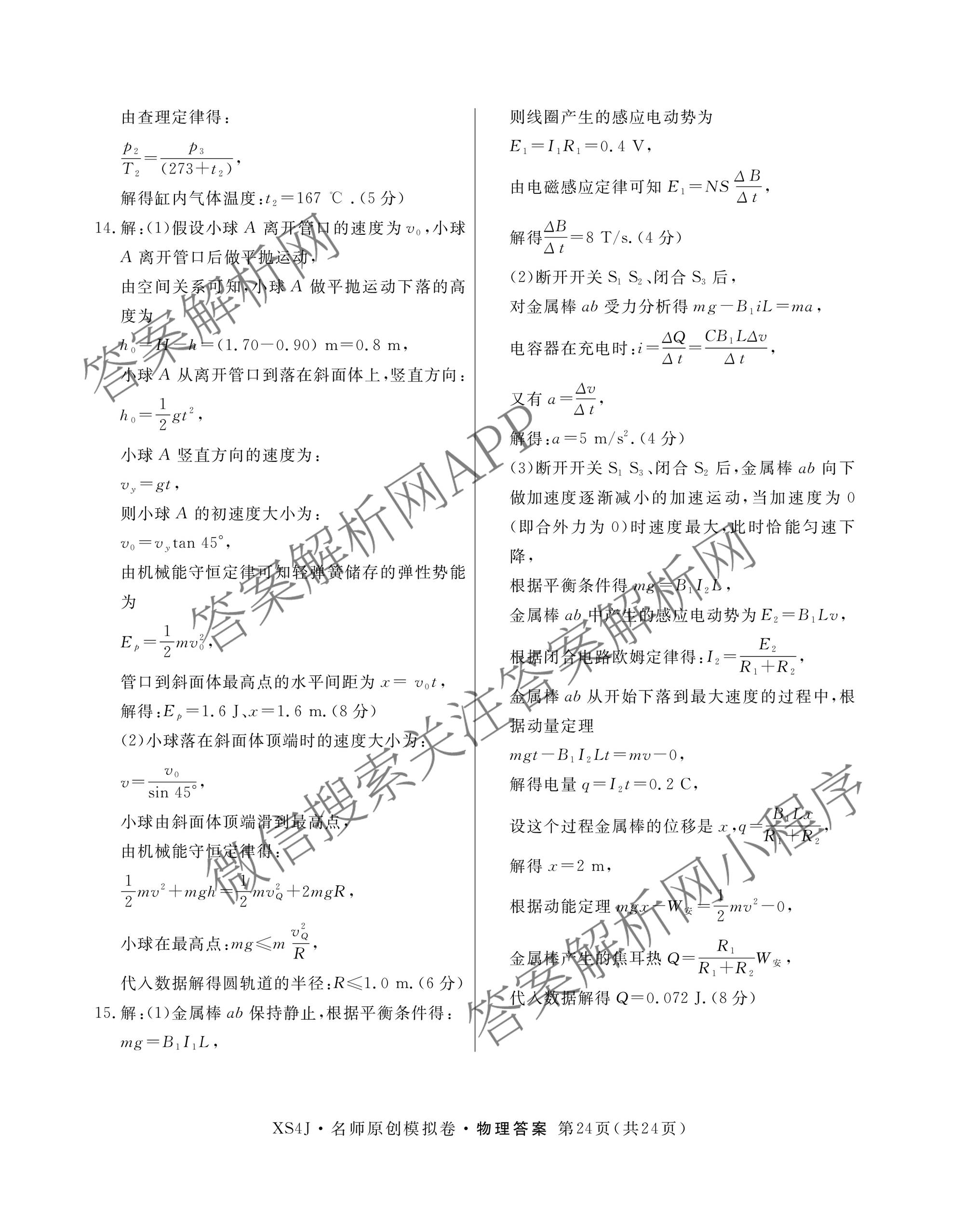 - 2024届[高三]总复习名师原创分科模拟 物理(ZS4)(六)6答案