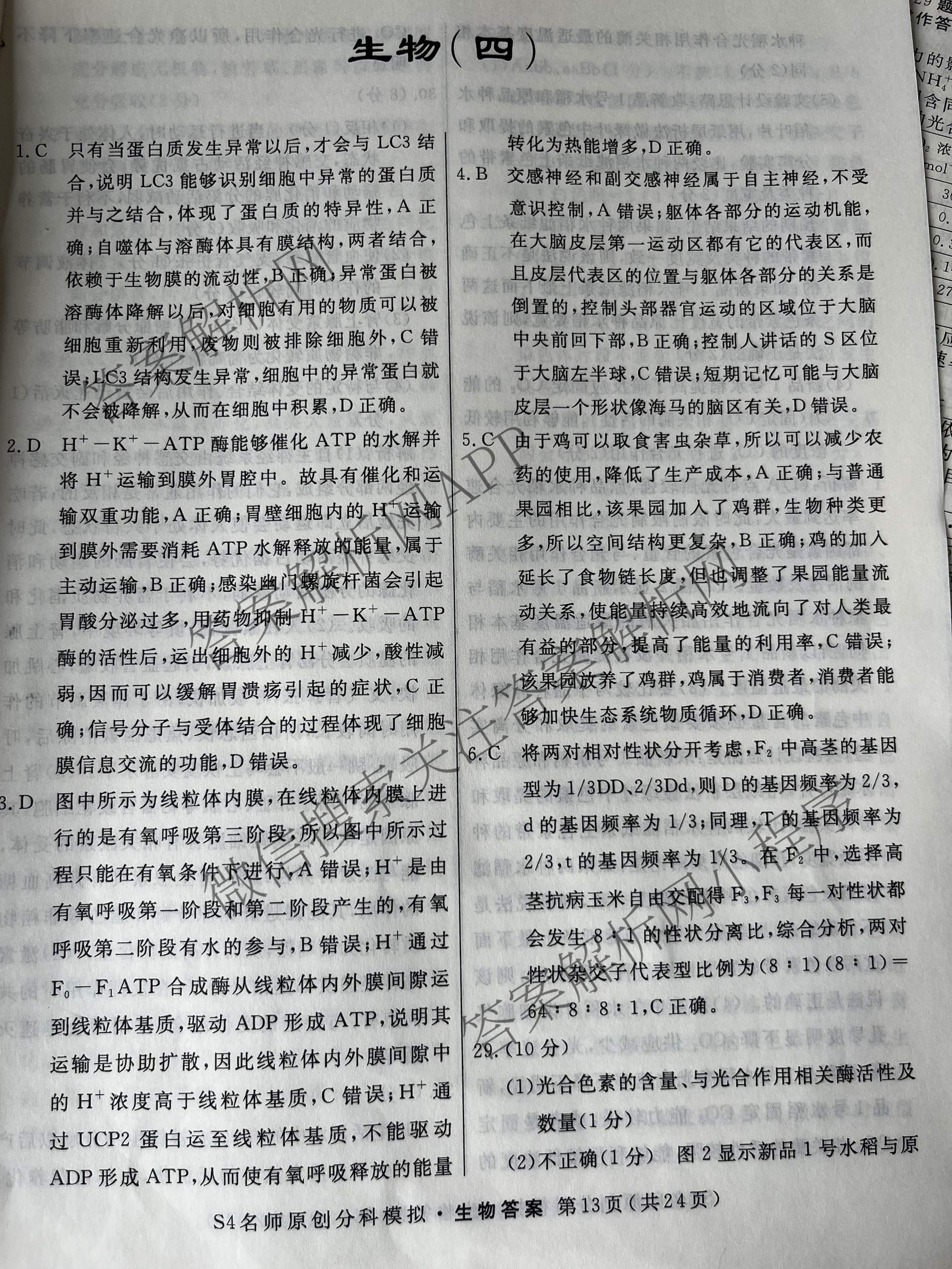 - 2024届高三总复习名师原创分科模拟 生物(S4)(一)1答案