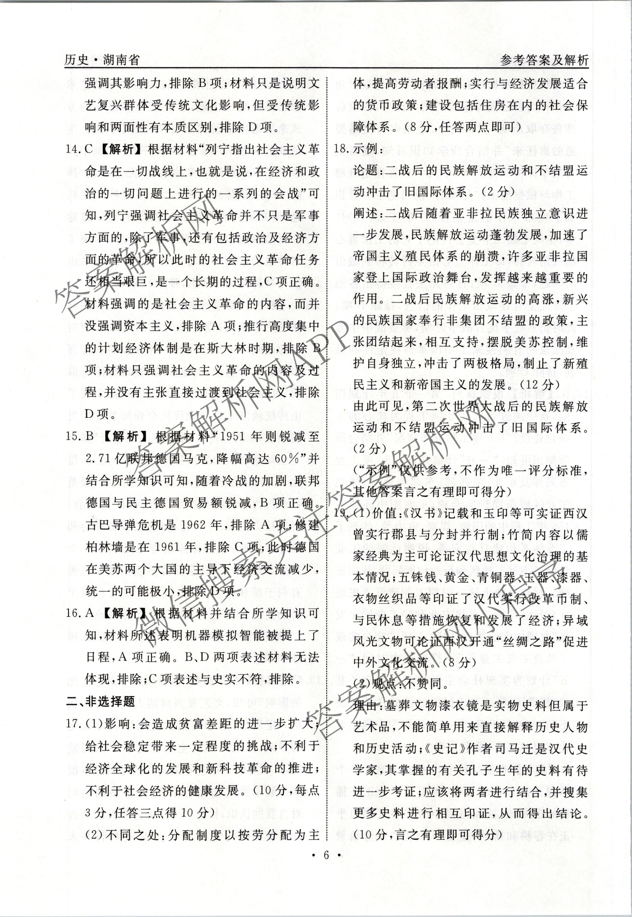 衡水名师卷高考模拟检测卷 湖南省2024年普通高等学校招生全国统一考试模拟试题 历史(二)2答案