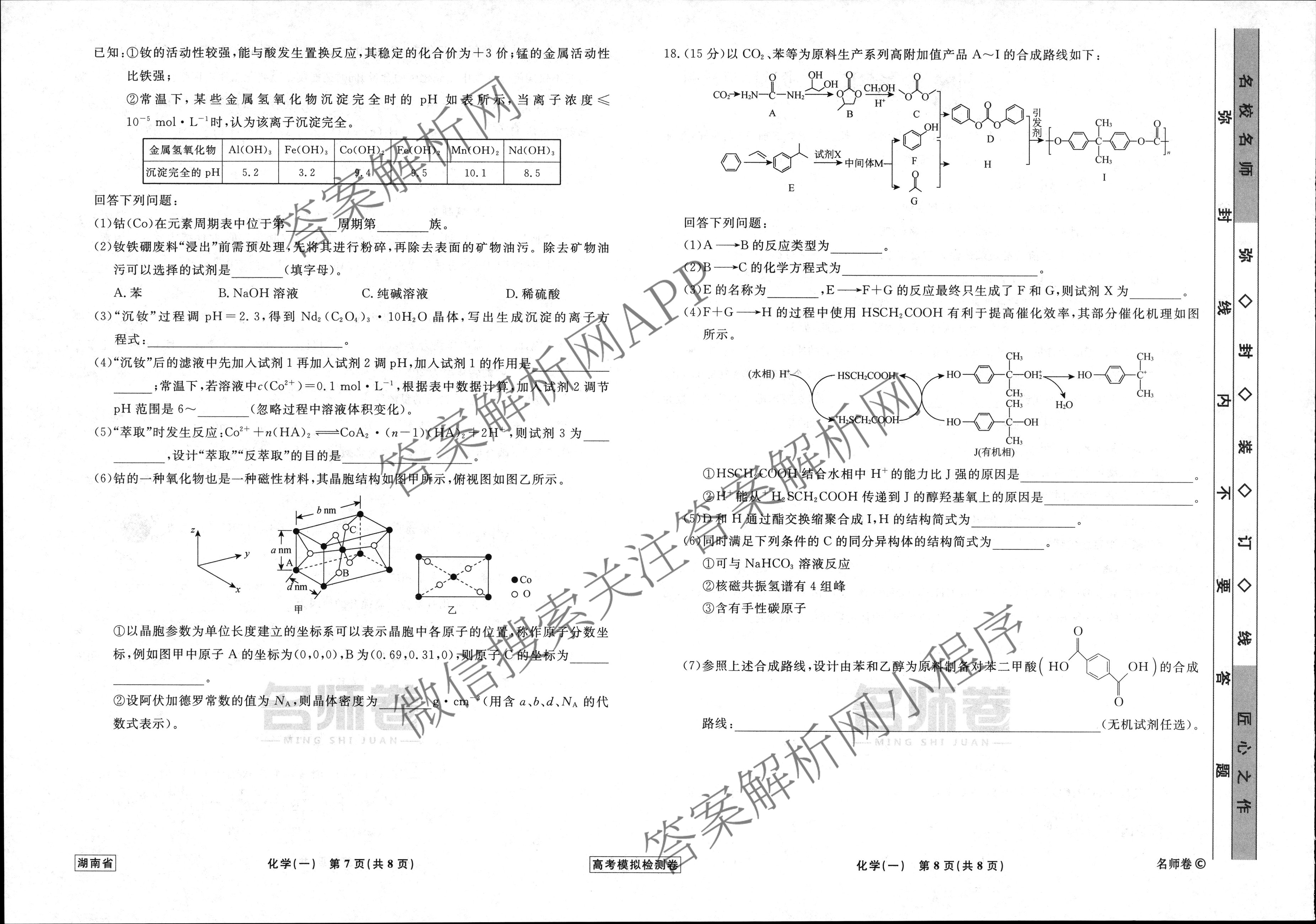 - [高三]衡水名师卷高考模拟检测卷 湖南省2024年普通高等学校招生全国统一考试模拟试题 化学(一)1答案