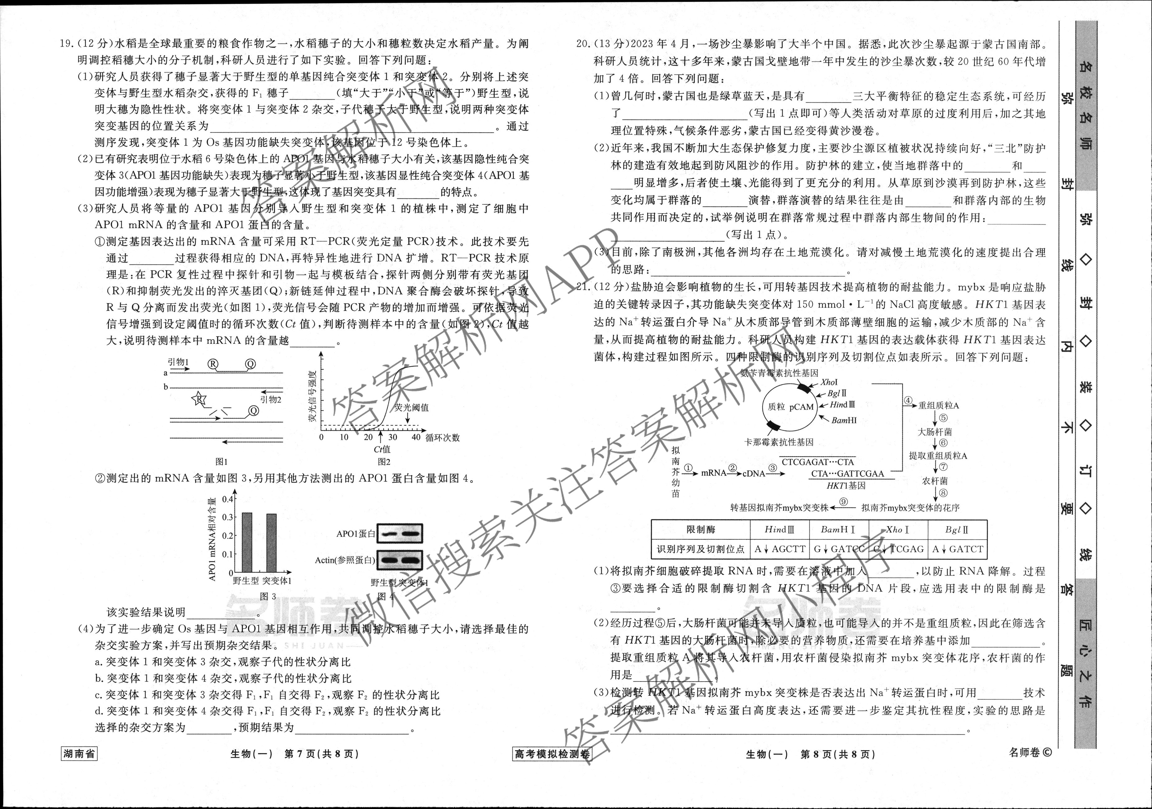 - (高三)衡水名师卷高考模拟检测卷 安徽省2024年普通高等学校招生全国统一考试模拟试题 生物(一)1答案