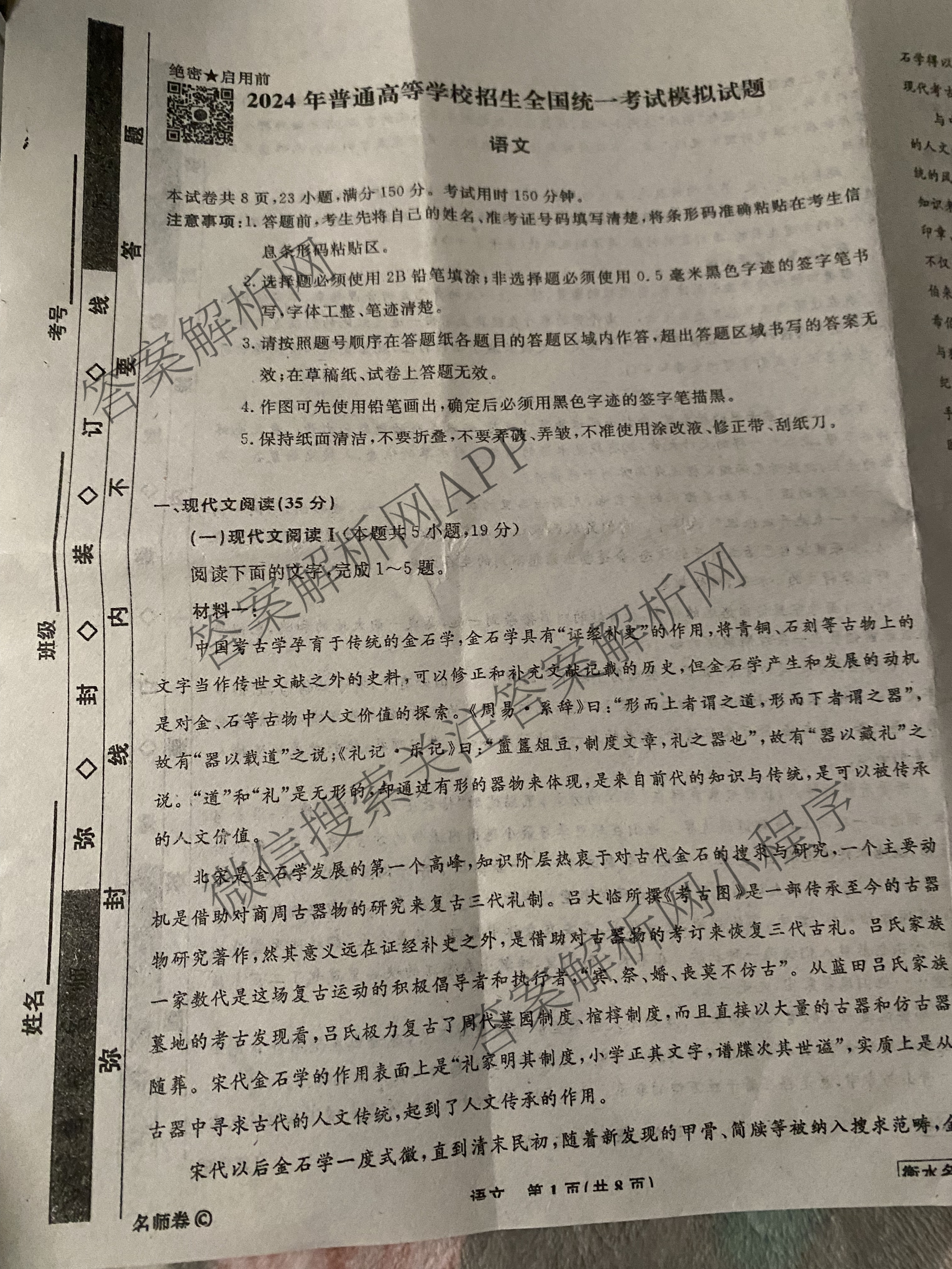 (高三)[衡水名师卷]·高考模拟卷 2024年普通高等学校招生全国统一考试模拟试题 语文(空心◇)(一)1试题