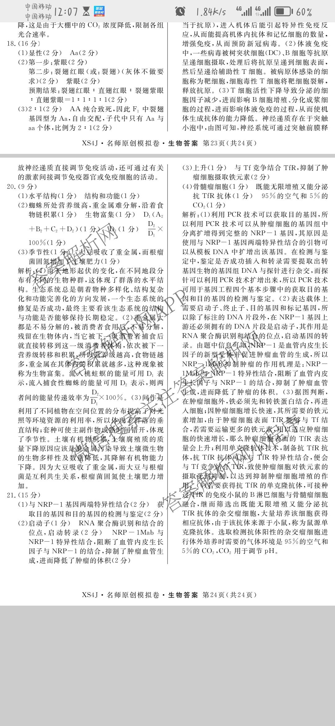 - 2024届[高三]总复习名师原创分科模拟 生物(S4)(六)6答案