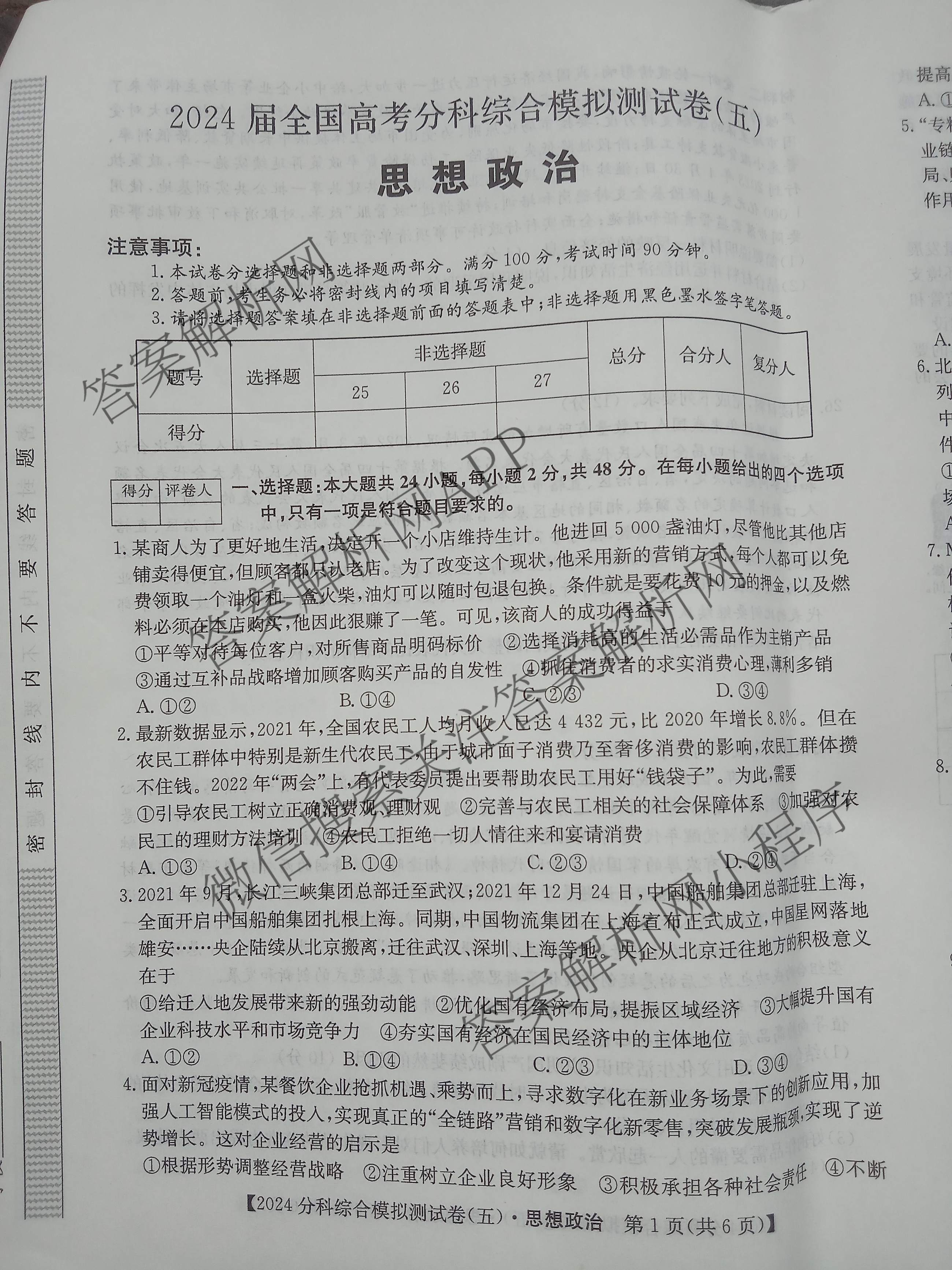 2024届全国高考分科综合模拟测试卷(五)5政治(老高考)试题