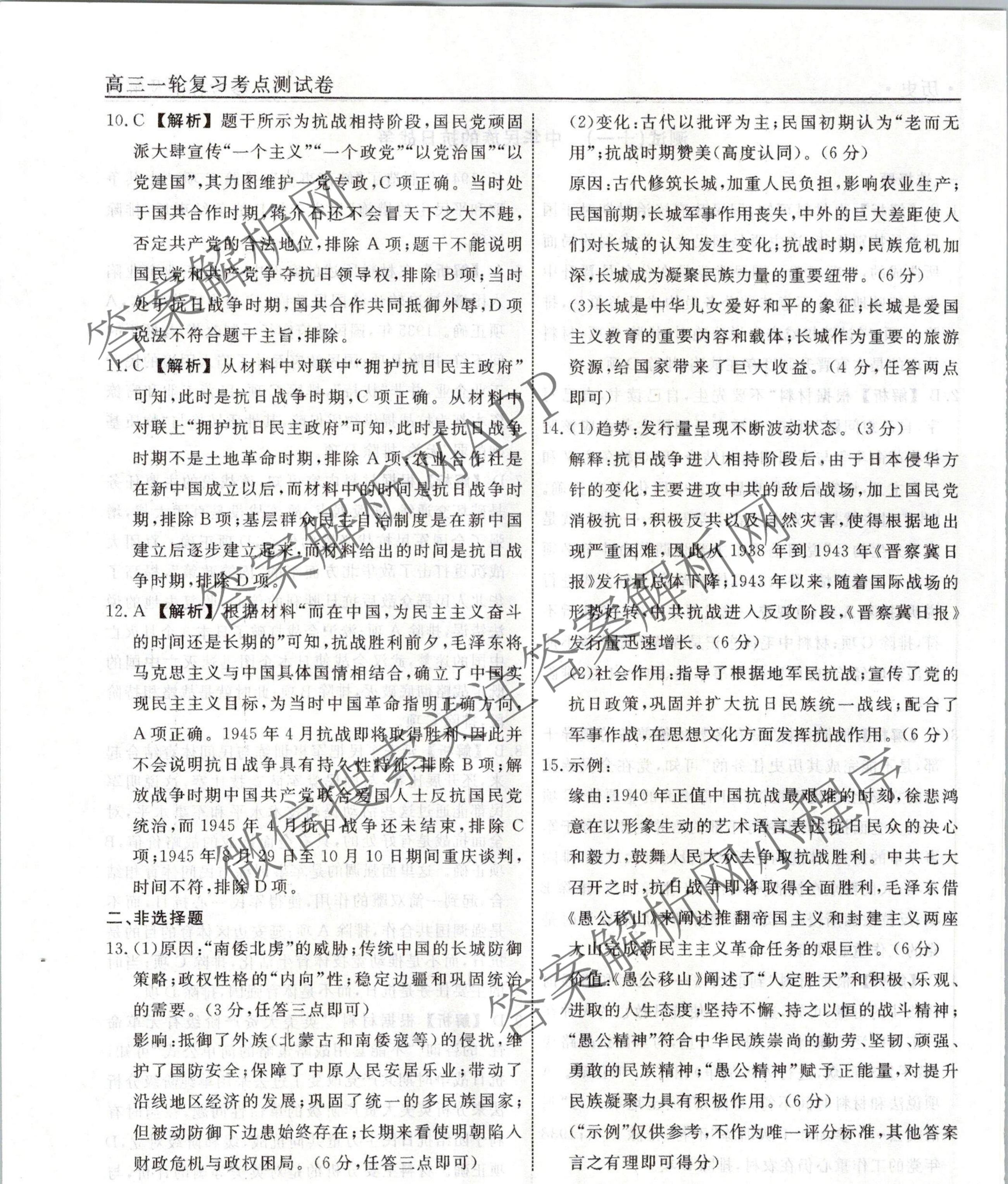 衡水名师卷2023-2024学年度高三一轮复习考点测试卷历史(40分钟实心菱形)(十一)11答案