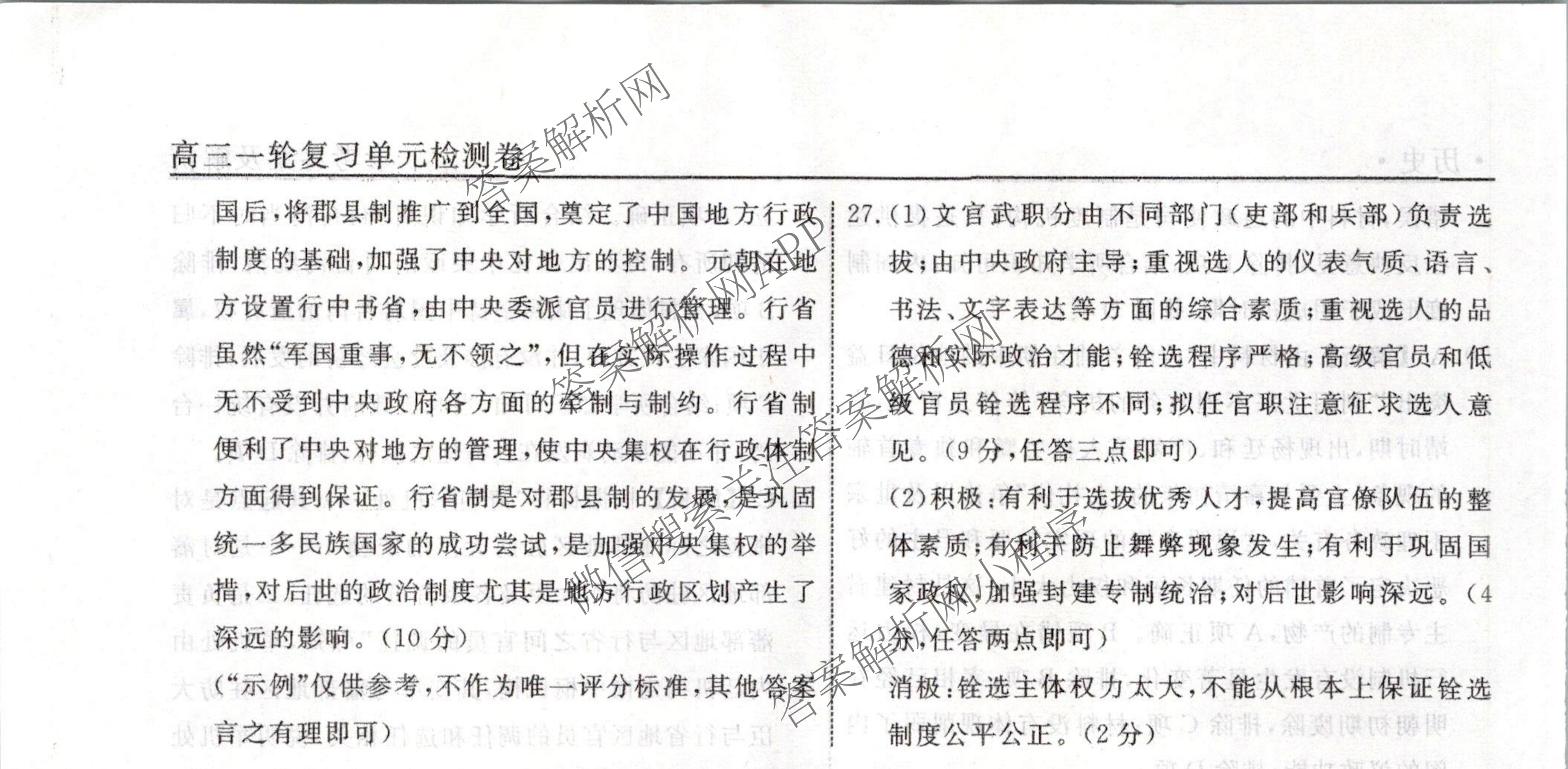 衡水名师卷2023-2024学年度高三一轮复习单元检测卷历史(空心菱形)检测(一)1答案