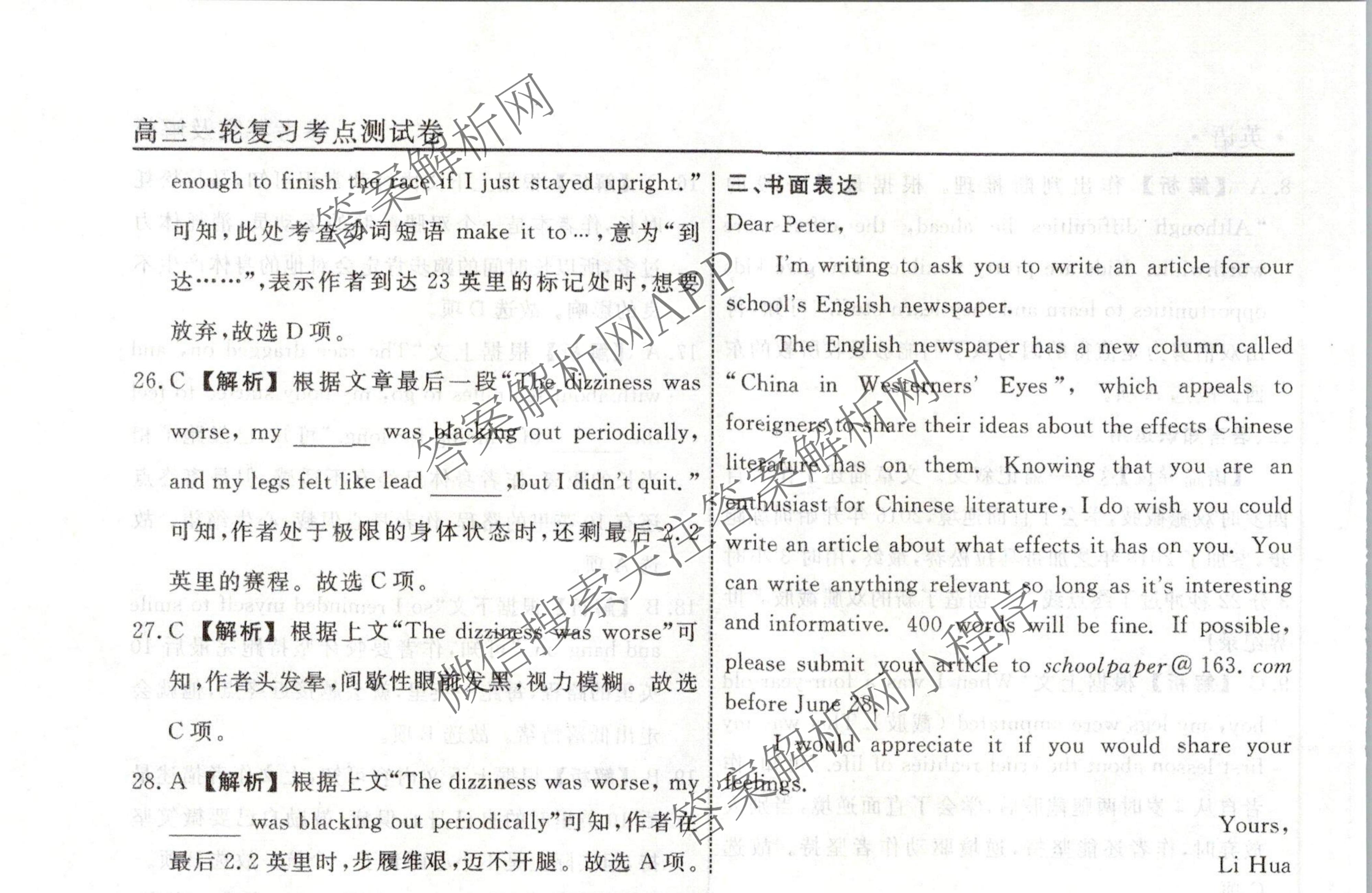 衡水名师卷2023-2024学年度高三一轮复习考点测试卷英语(40分钟空心菱形)(二十六)26答案