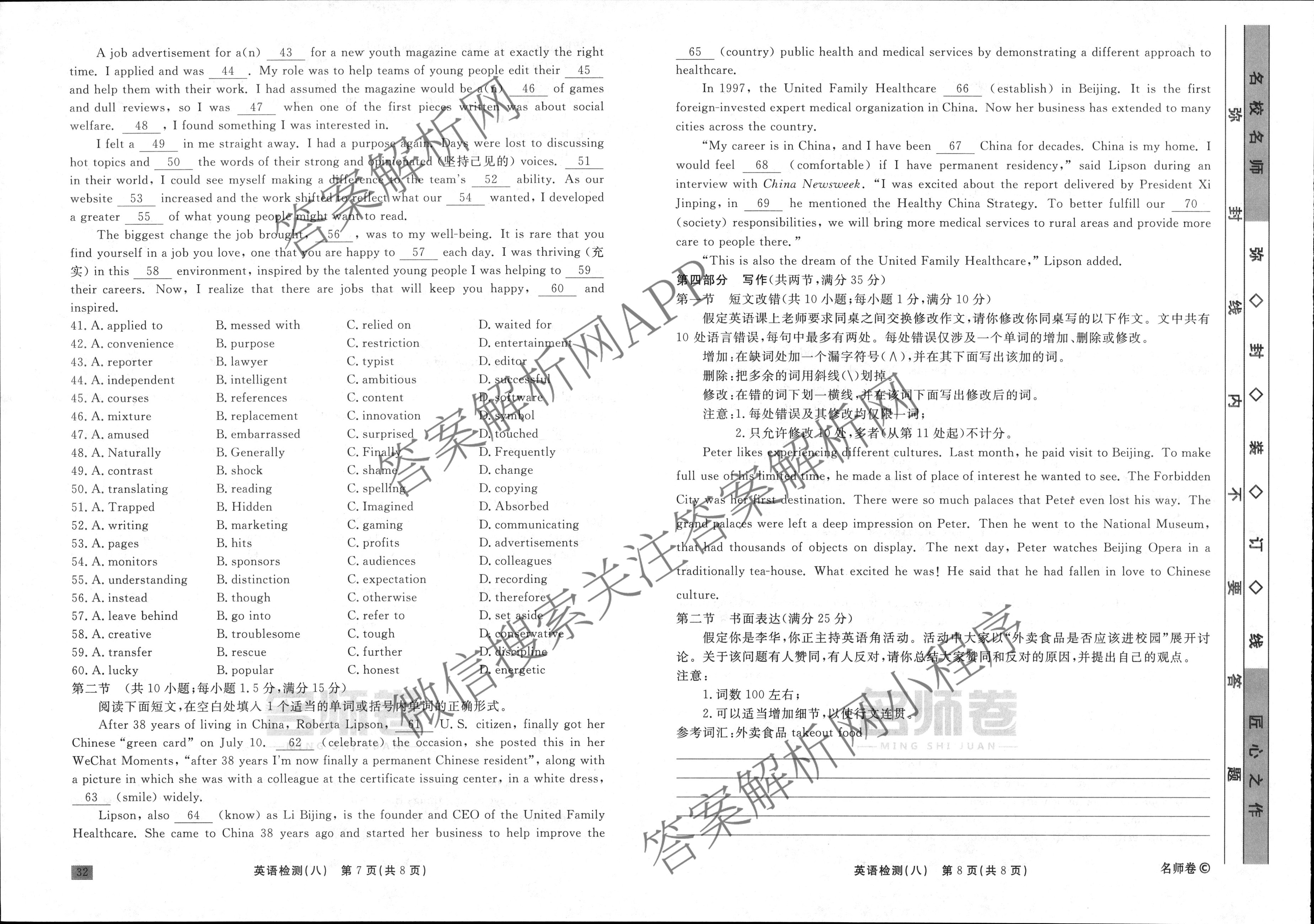衡水名师卷2023-2024学年度高三一轮复习单元检测卷英语(空心菱形)检测(八)8试题