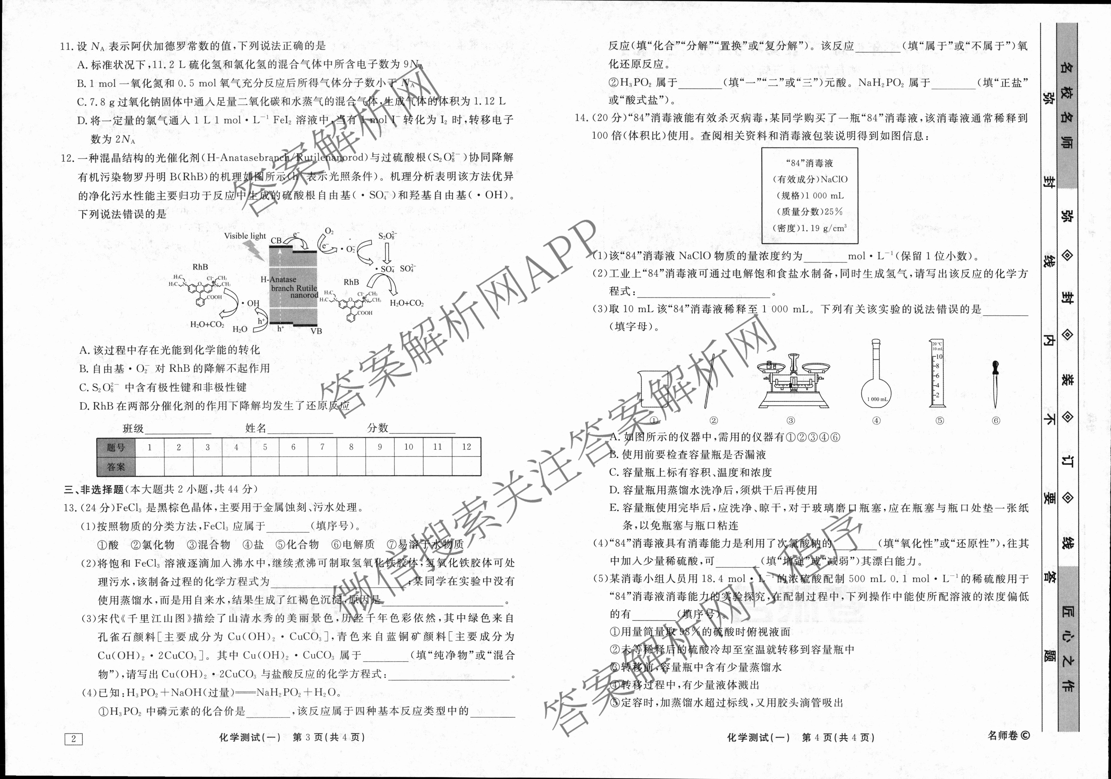 衡水名师卷2023-2024学年度高三一轮复习考点测试卷化学(40分钟双菱形)(一)1试题