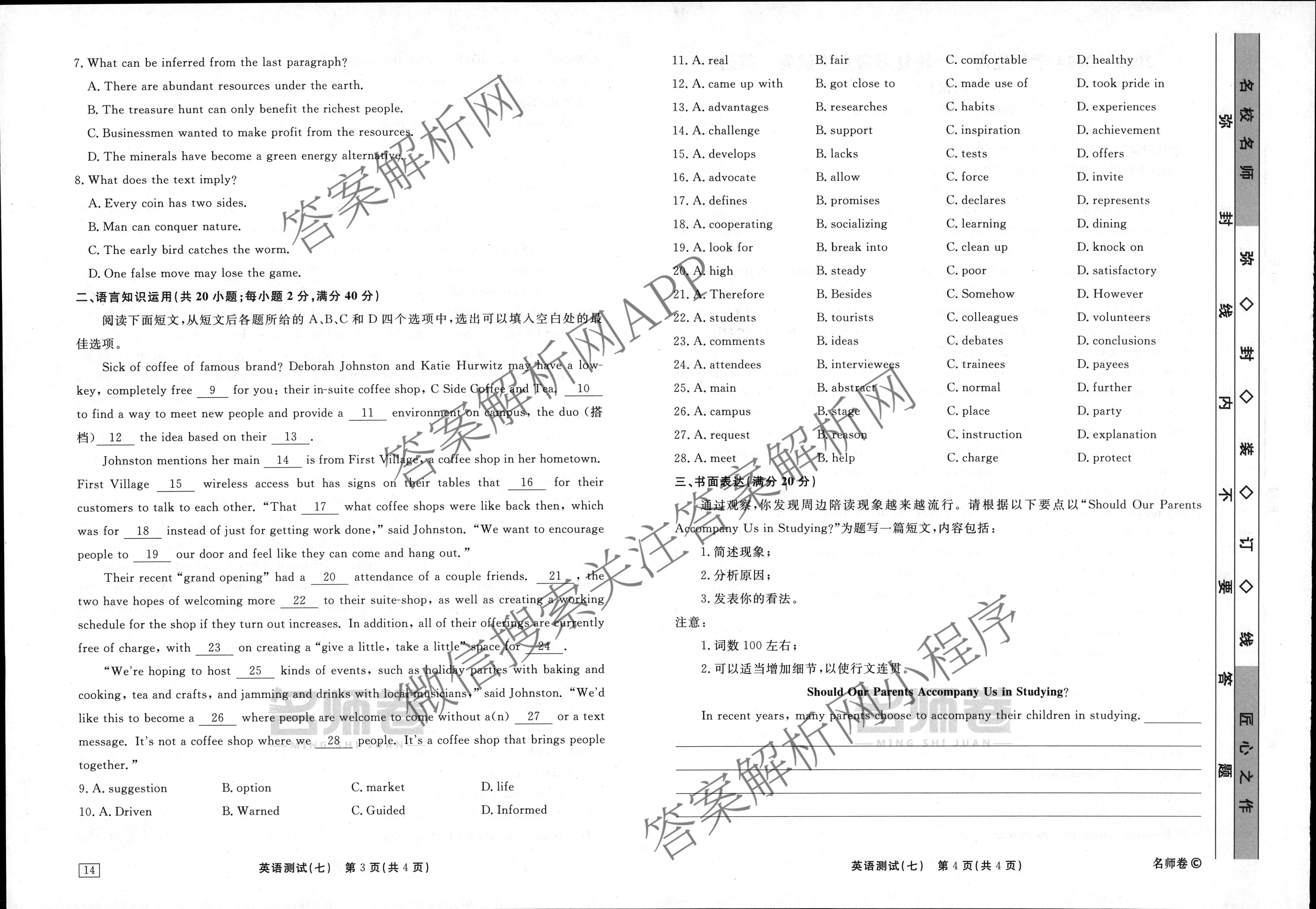 衡水名师卷2023-2024学年度高三一轮复习考点测试卷英语(40分钟空心菱形)(七)7试题