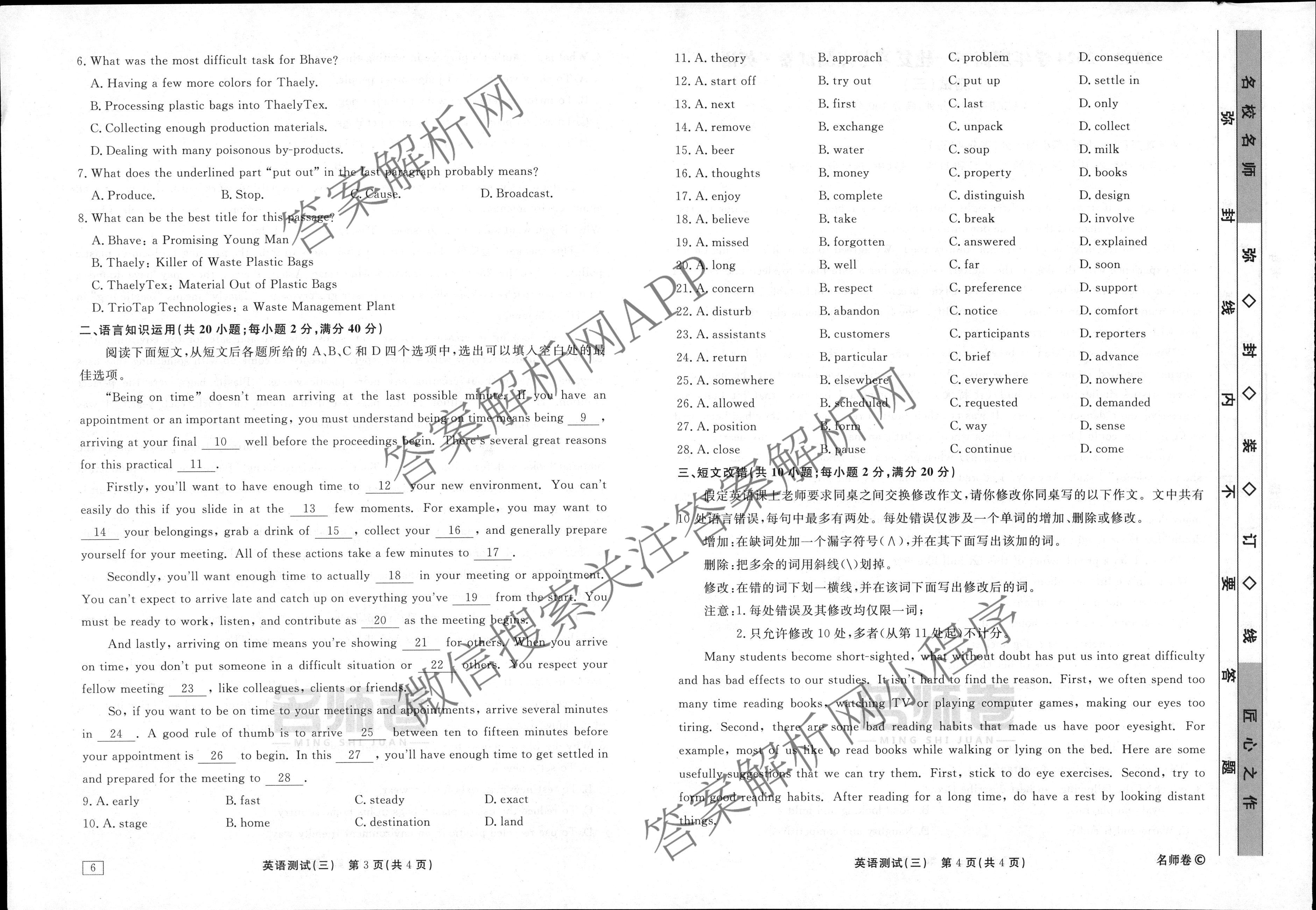 衡水名师卷2023-2024学年度高三一轮复习考点测试卷英语(40分钟空心菱形)(三)3试题