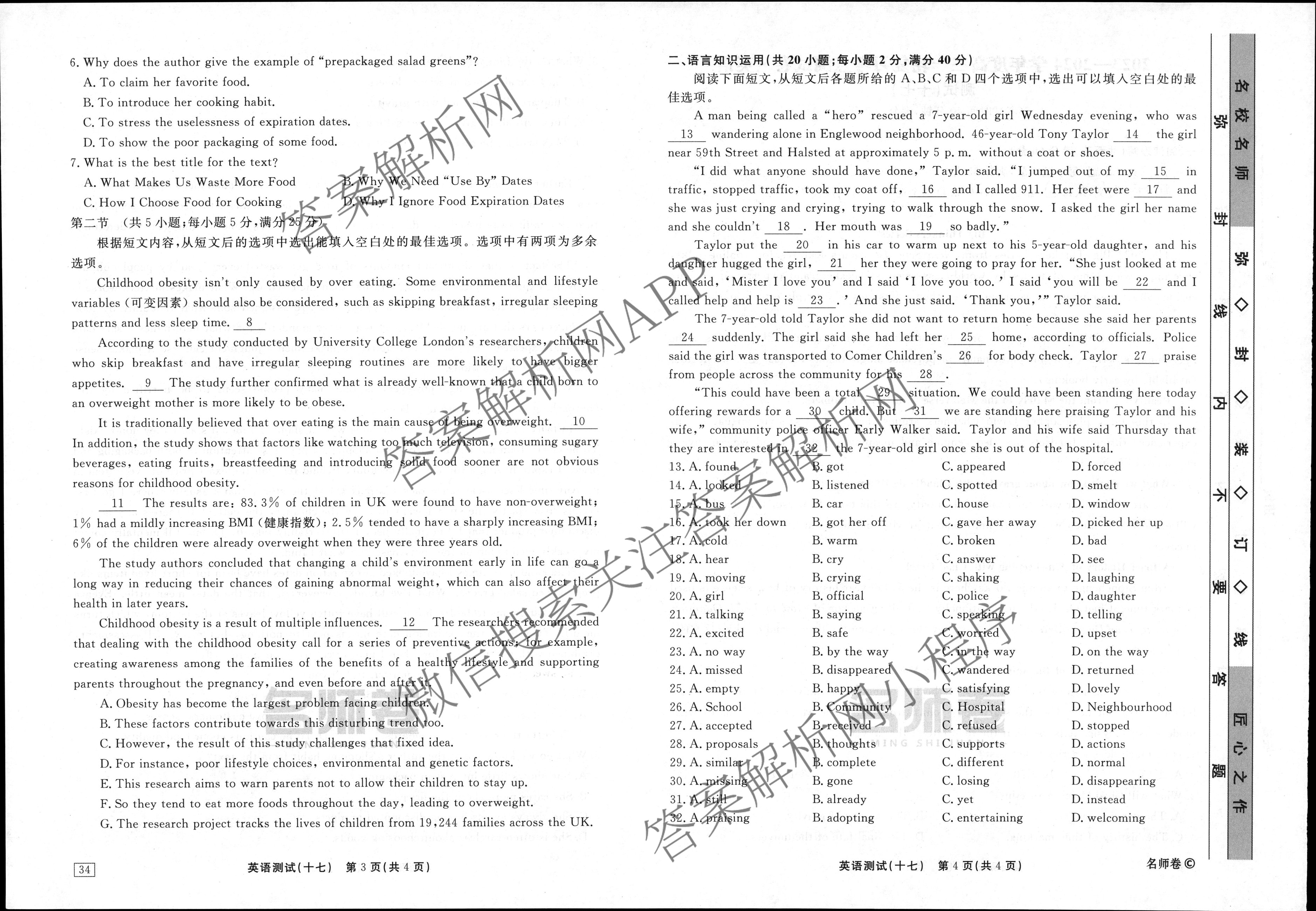 衡水名师卷2023-2024学年度高三一轮复习考点测试卷英语(40分钟空心菱形)(十七)17试题