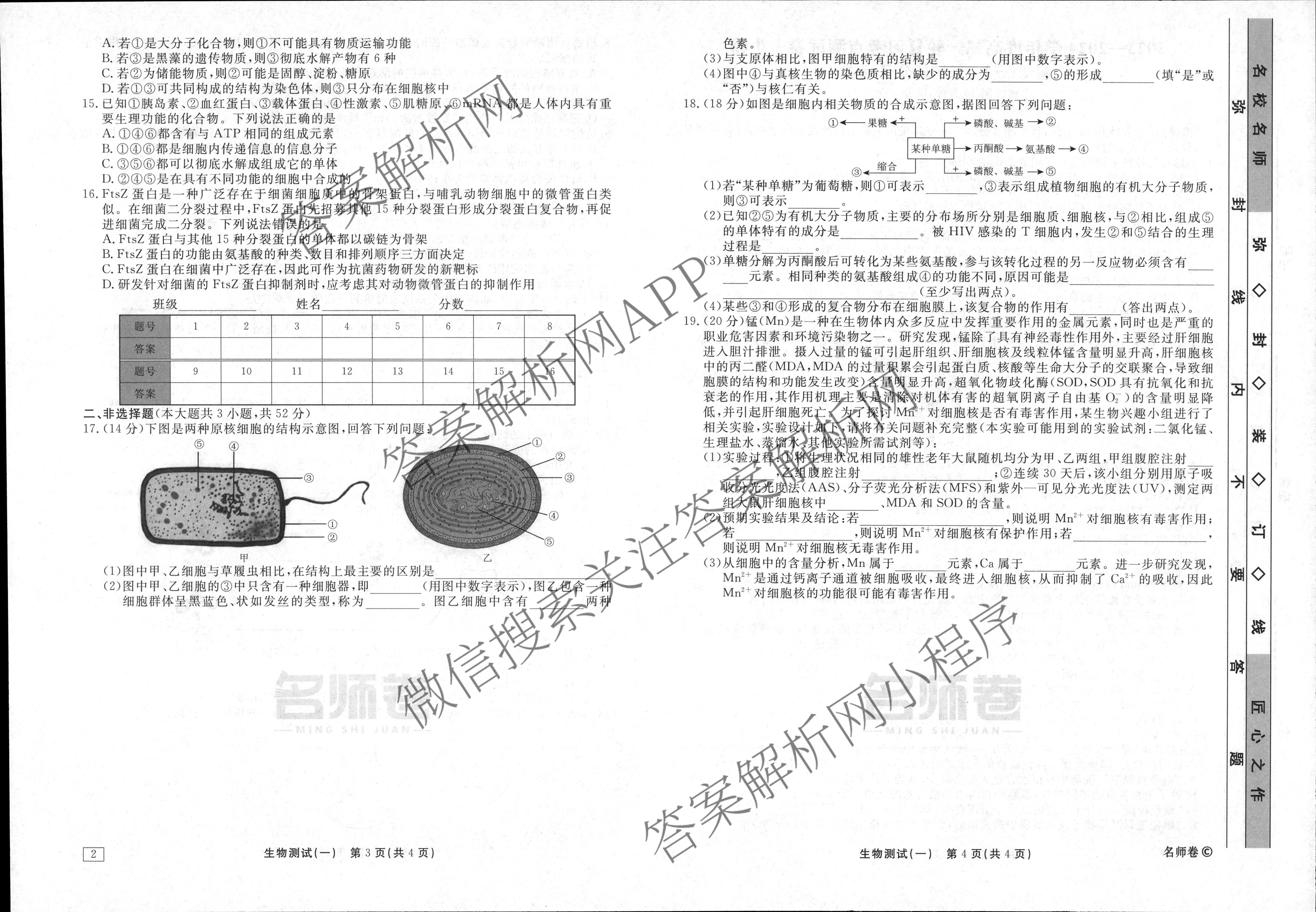衡水名师卷2023-2024学年度高三一轮复习考点测试卷生物(40分钟空心菱形)(一)1试题