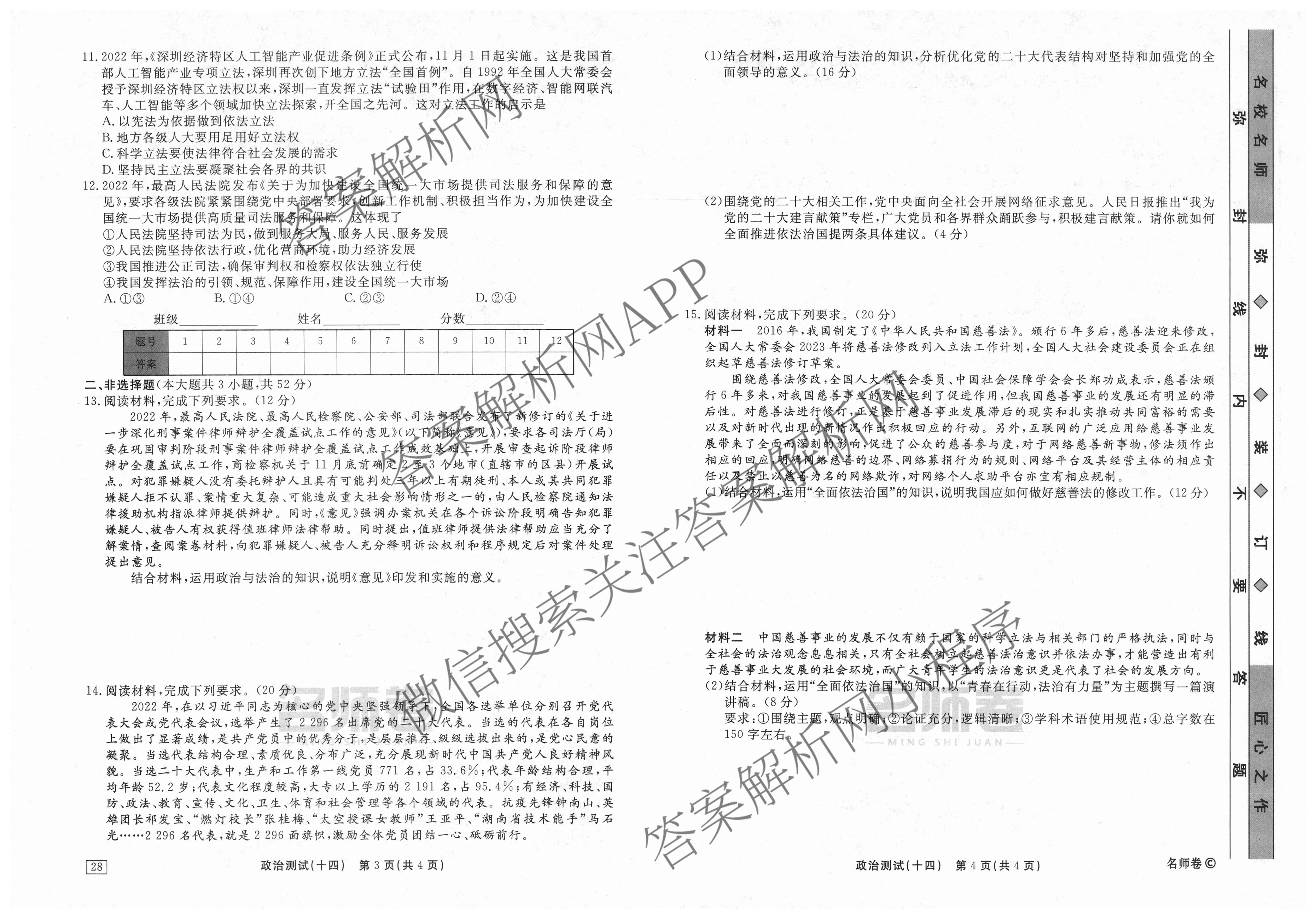 衡水名师卷2023-2024学年度高三一轮复习考点测试卷政治(40分钟实心菱形)(十四)14试题