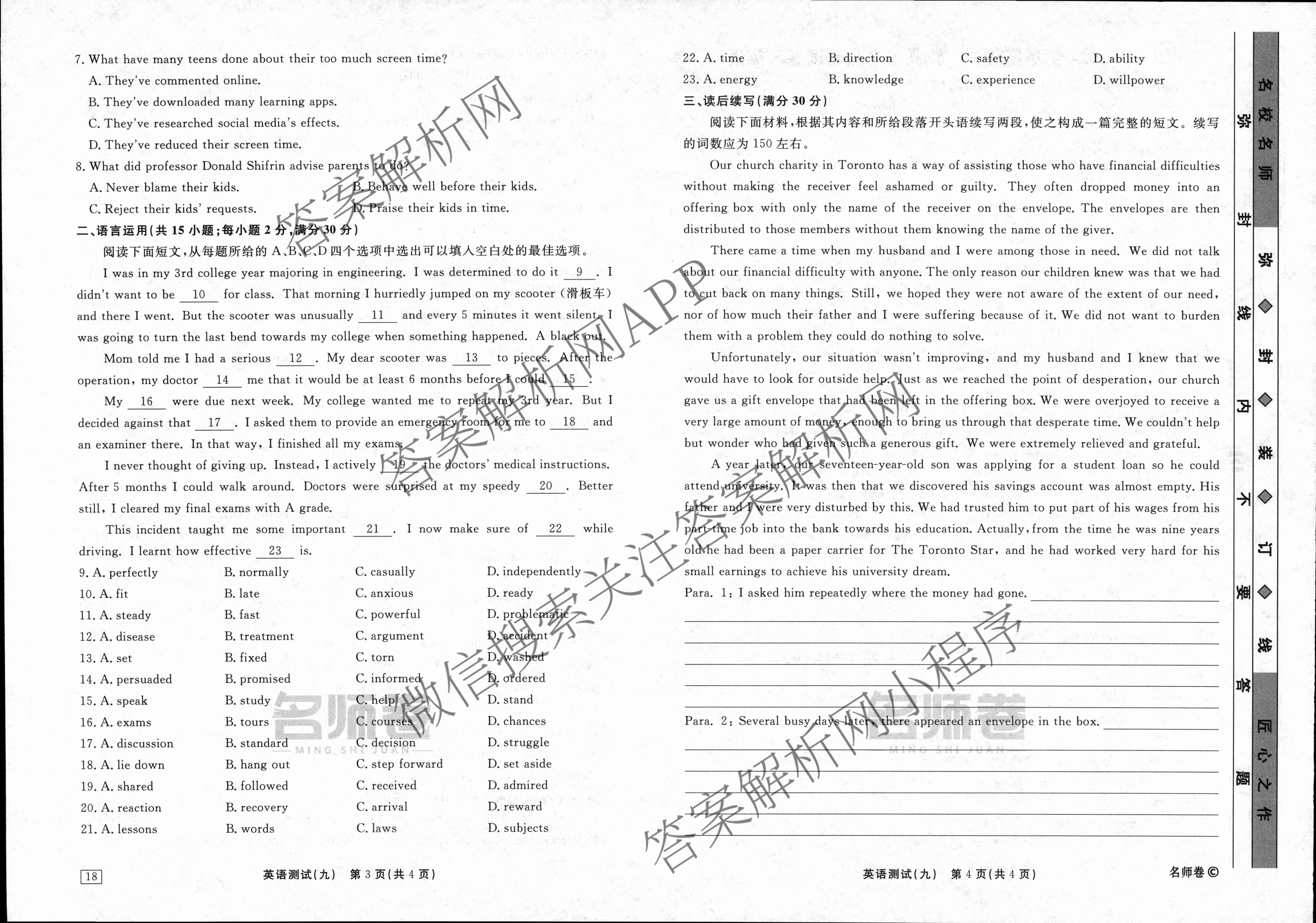 衡水名师卷2023-2024学年度高三一轮复习考点测试卷英语(40分钟实心菱形)(九)9试题