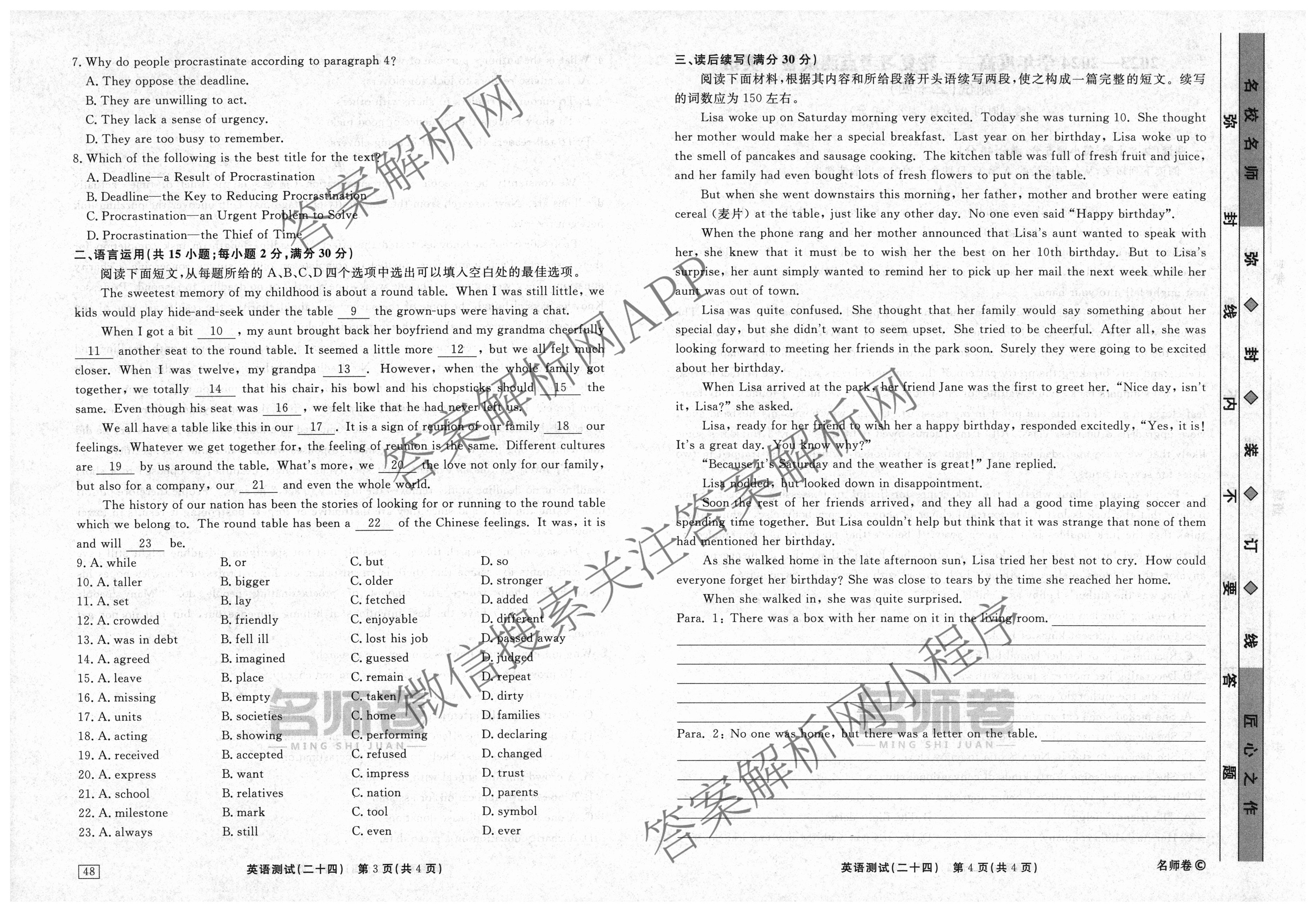 衡水名师卷2023-2024学年度高三一轮复习考点测试卷英语(40分钟实心菱形)(二十四)24试题