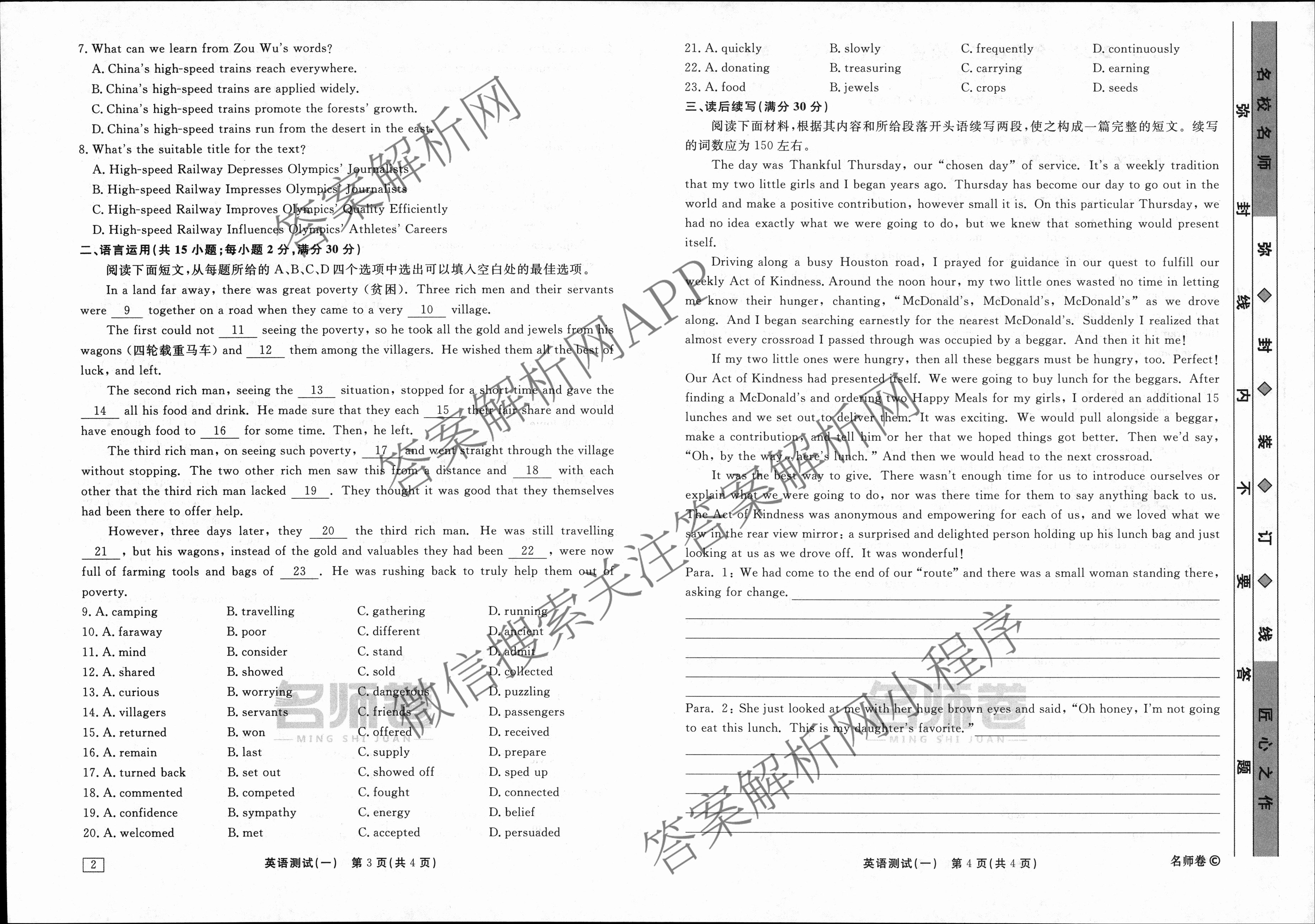 衡水名师卷2023-2024学年度高三一轮复习考点测试卷英语(40分钟实心菱形)(一)1试题