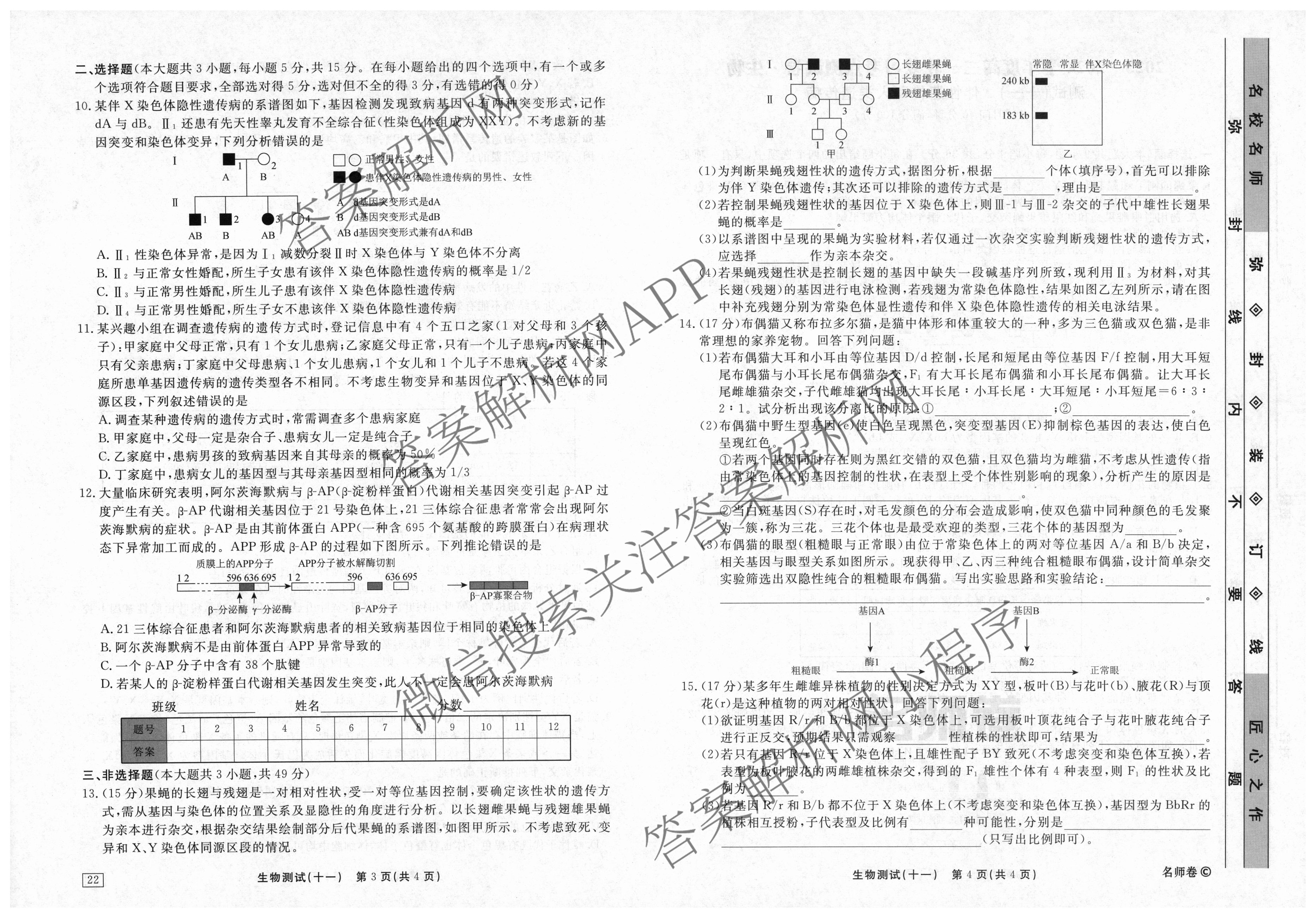衡水名师卷2023-2024学年度高三一轮复习考点测试卷生物(40分钟双菱形)(十一)11试题