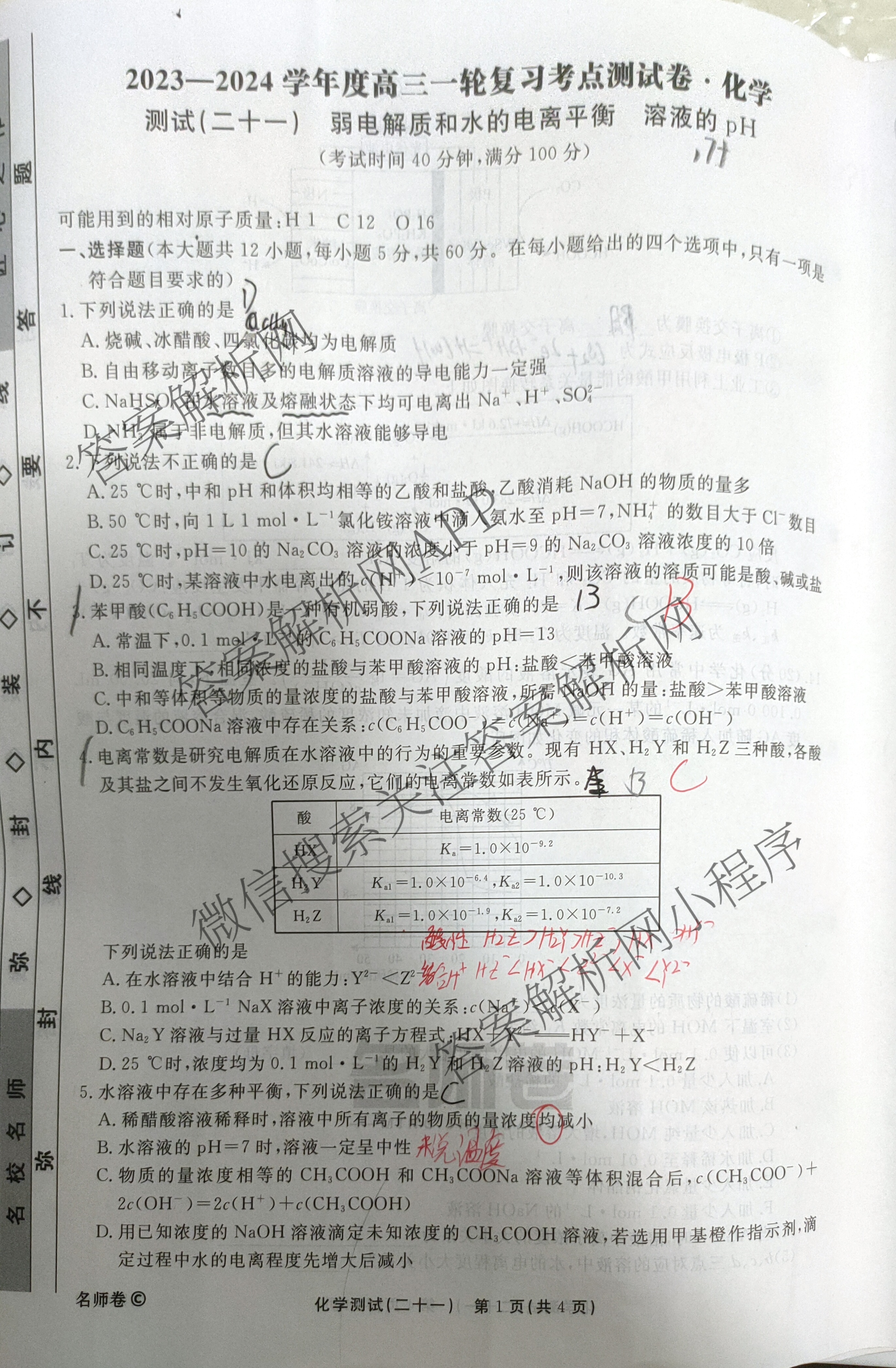 衡水名师卷2023-2024学年度高三一轮复习考点测试卷化学(二十一)21试题